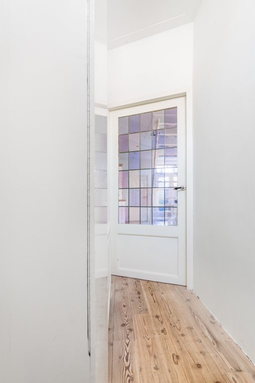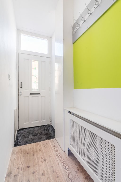 Via de mooie voordeur kom je in de hal die in verbinding staat met de woonkamer. Links in de hal is ruimte voor een kapstok en de radiator is voorzien van een ombouw. De grenen vloer in de hal en woonkamer zorgt, net als de hoge plafonds, voor veel sfeer.