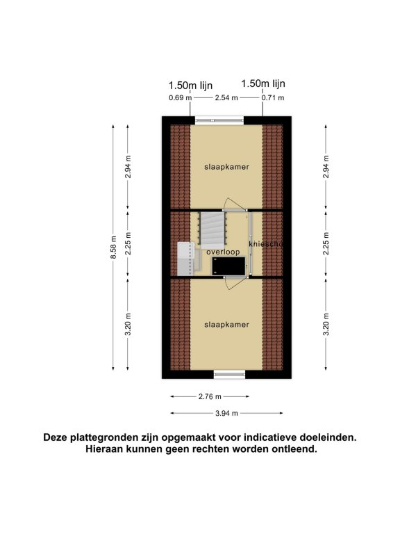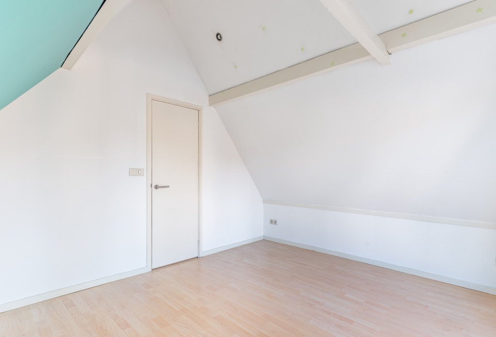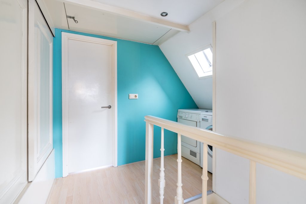 De wasmachine en droger kunnen op de overloop staan, waar het dakraam voor veel lichtinval zorgt. In de schuinte van het dak is een berging met schuifdeuren en op de hele verdieping ligt laminaat.