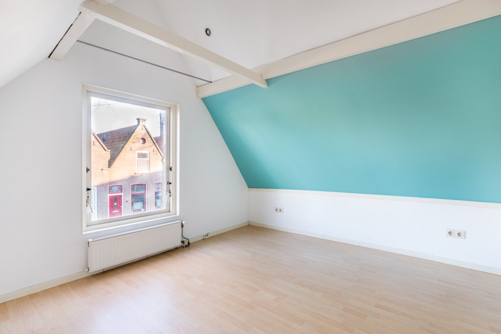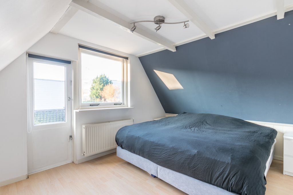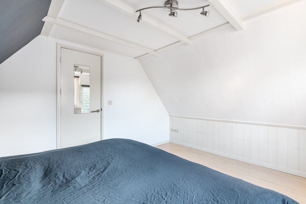 Op de eerste verdieping zijn de overloop en twee ruime slaapkamers. De slaapkamer aan de voorzijde heeft een hoge nok, de houten dakconstructie in het zicht, inbouwverlichting en mooi uitzicht naar de Lindenlaan. Aan de achterzijde is de tweede slaapkamer, van waaruit je het platte dak kunt bereiken.