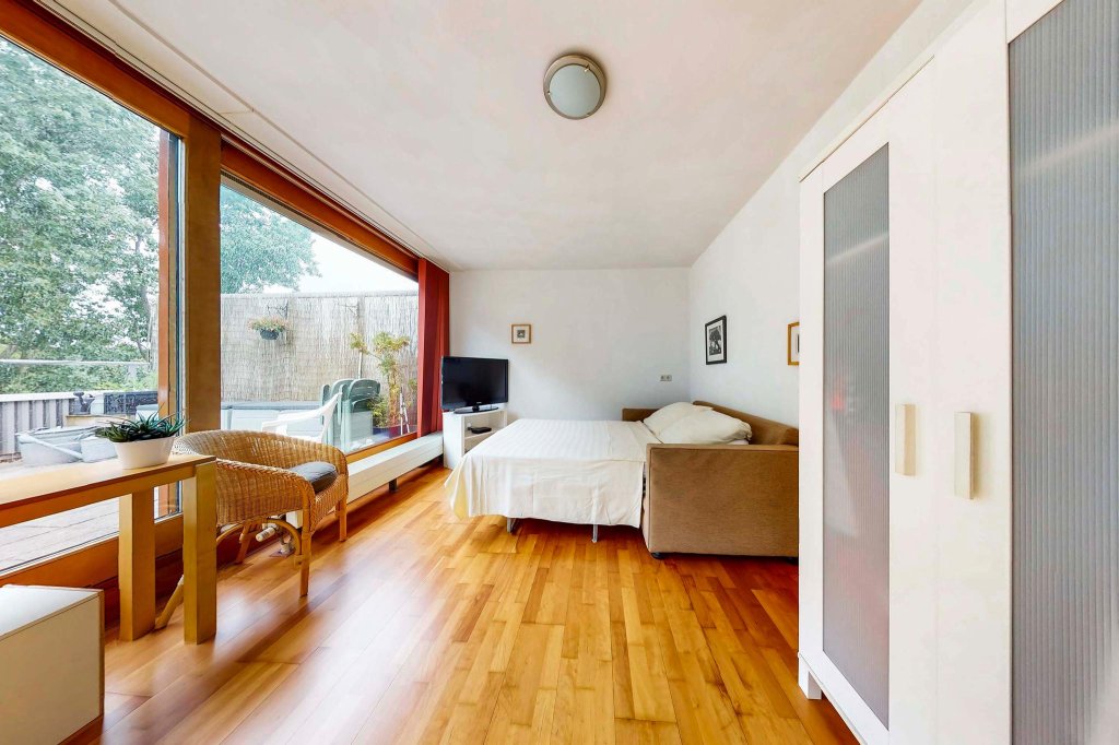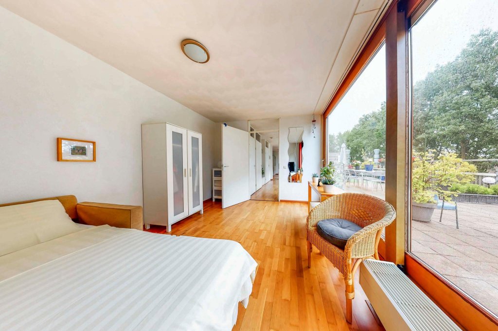 U betreed de overloop, de grote slaapkamer kan je beter een 2e woonkamer noemen, hier is ook een kitchenette aanwezig en de schuifpui naar het dakterras.