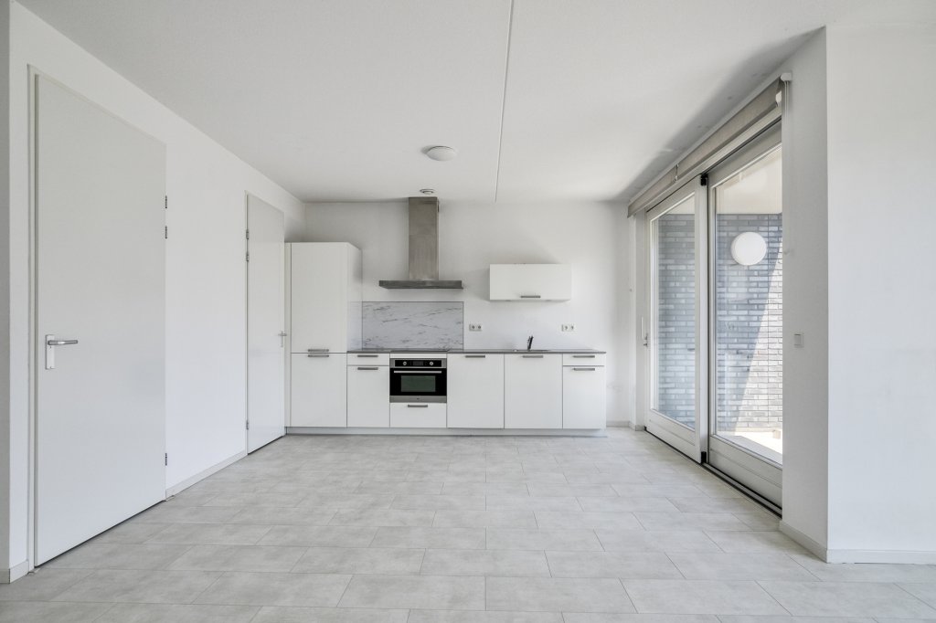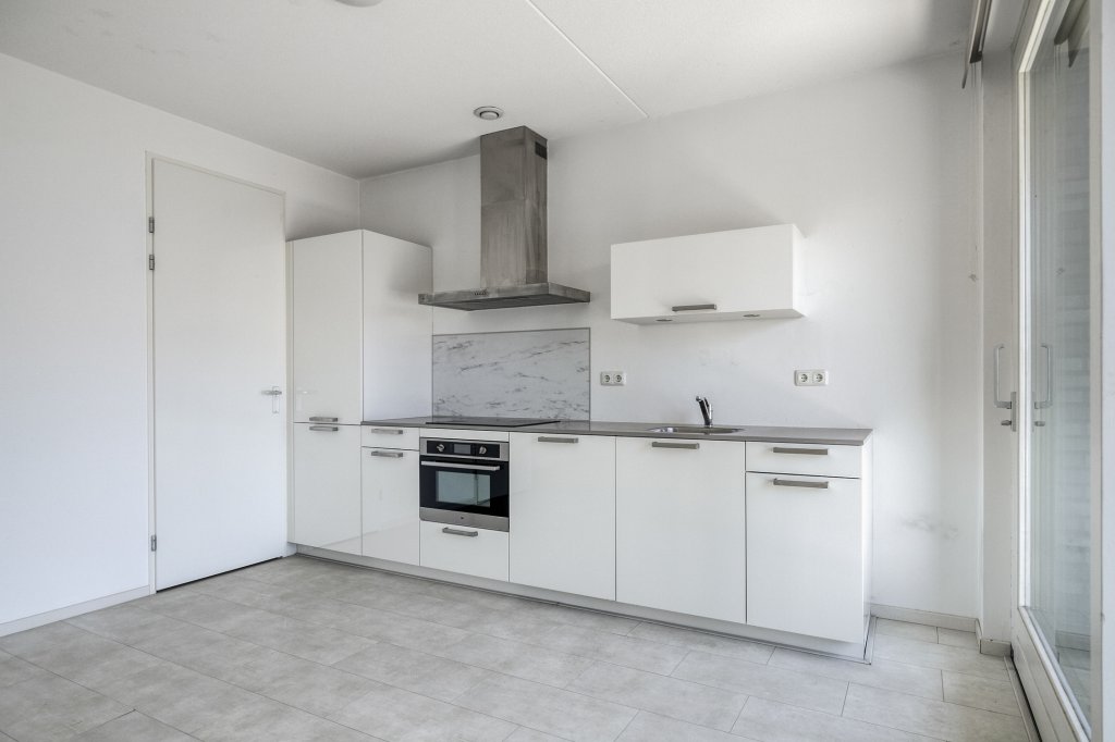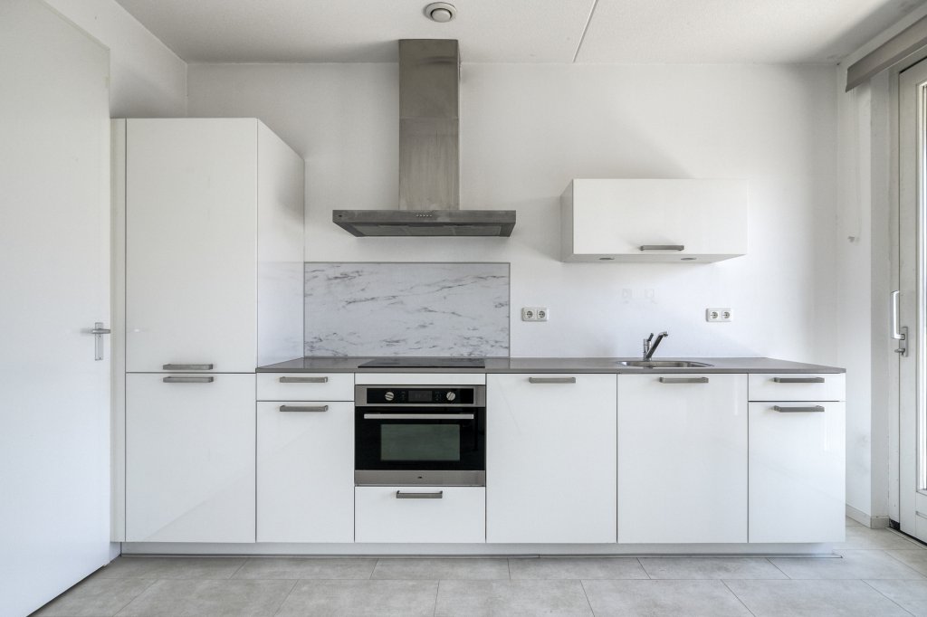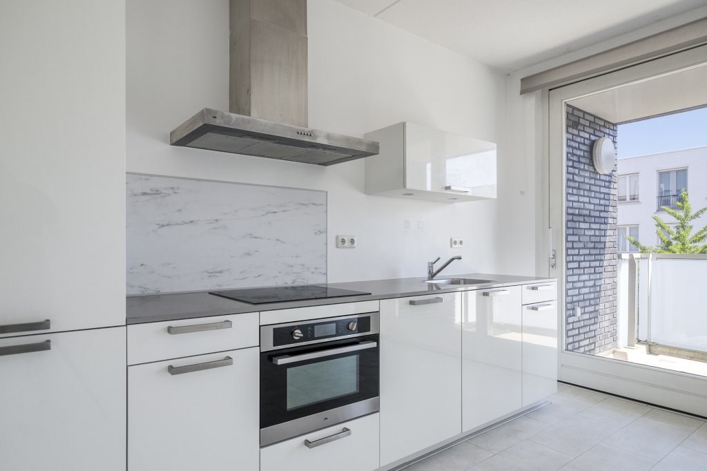 De open keuken is modern en voorzien van diverse inbouwapparatuur, waaronder een vaatwasser, oven en inductiekookplaat.