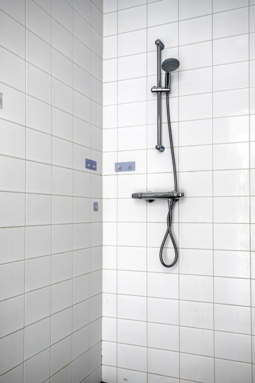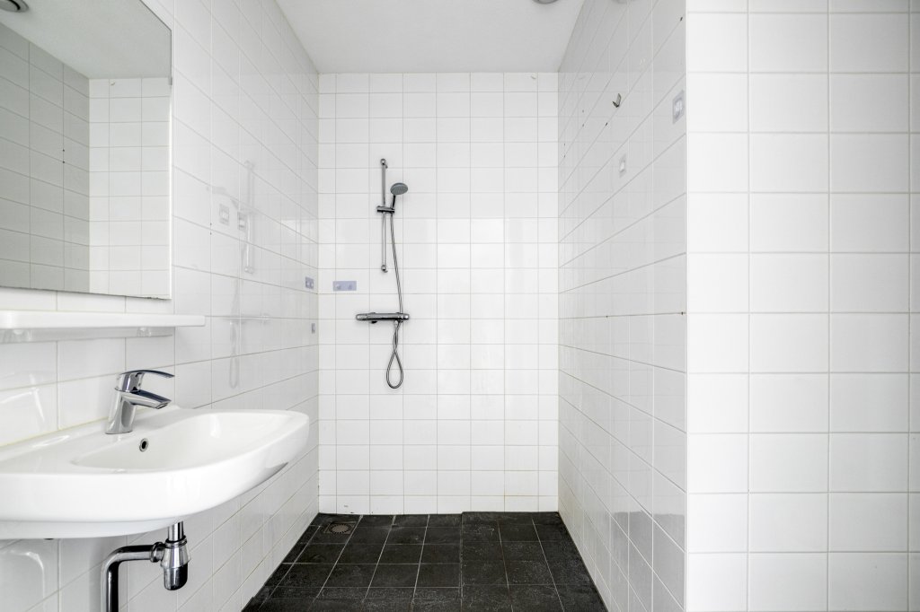 De ruime badkamer is netjes afgewerkt en voorzien van een douche, wastafel en toilet.