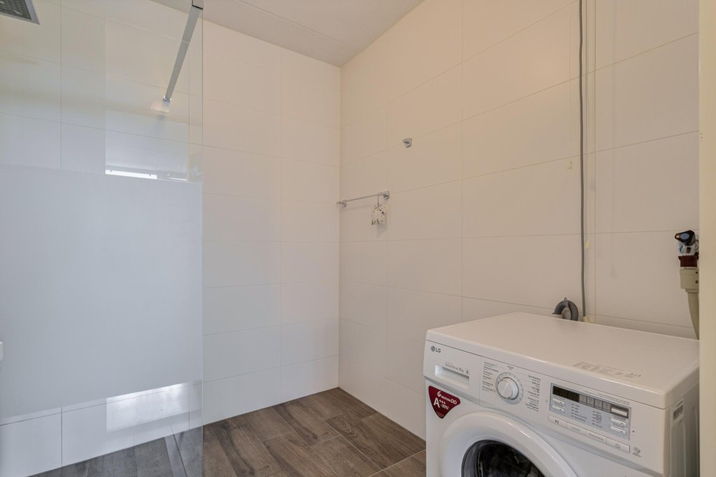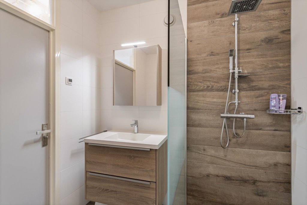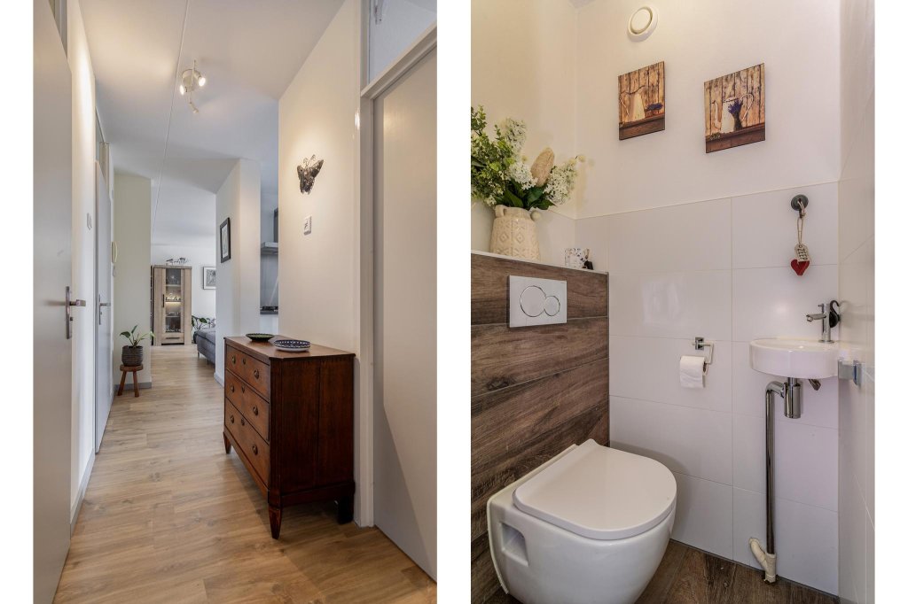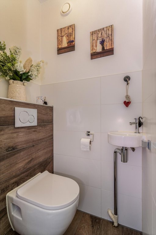 Terug naar de lange hal, hier is een separaat toilet welk in 2019 geheel is vernieuwd in dezelfde stijl als de badkamer. De badkamer (2019) is voorzien van warme tinten tegelwerk een grote inloopdouche en een luxe badkamermeubel. Koude voeten krijgt je hier niet, er is hier een heerlijke vloerverwarming geplaatst.