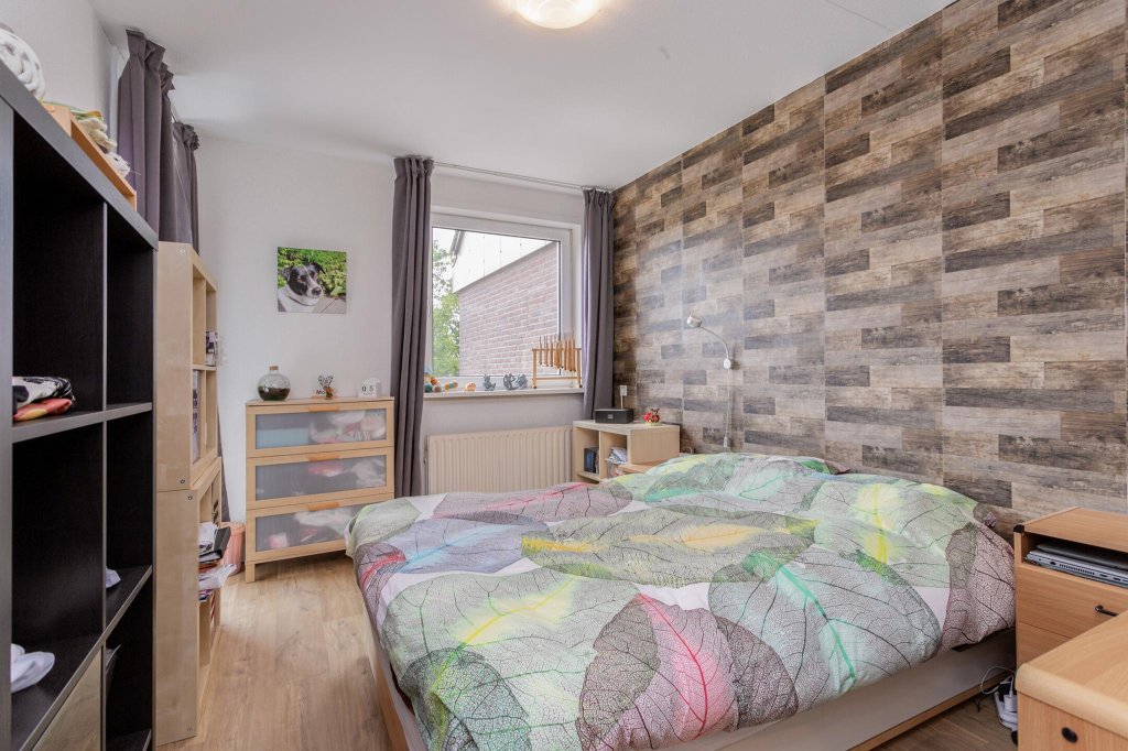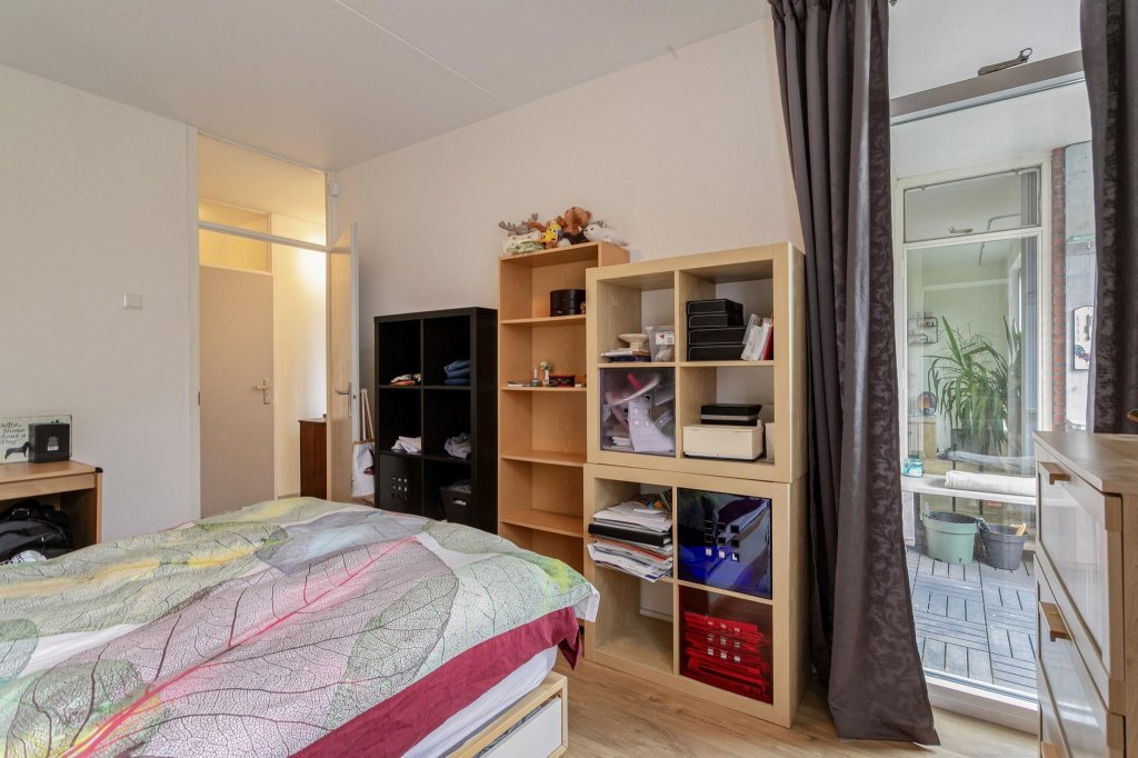 Aan de andere zijde van de hal bevindt zich de ruime slaapkamer met extra veel daglicht, dit komt door de aanwezigheid van een extra groot raam tot aan de vloer, welke uitkijkt op het balkon.