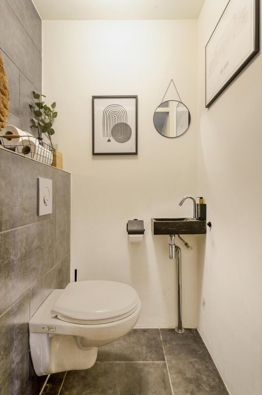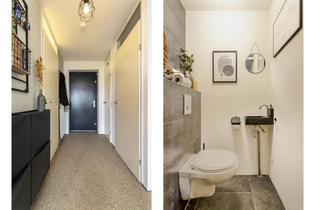 Hal met voldoende ruimte, direct links de meterkast en daarna bevindt zich een net vernieuwd toilet uit 2019.