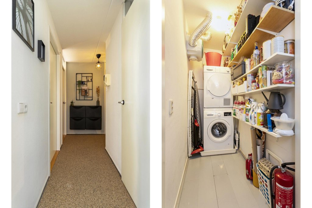 In de hal bevindt zich richting de woonkamer nog een fijn ruime inpandige berging met wasmachine aansluiting en voldoende opbergruimte erg prettig.