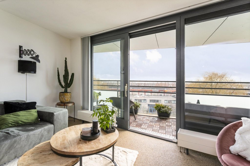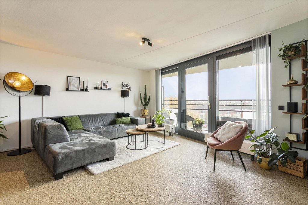 Bij de woonkamer hoort een heerlijk breed balkon op het zuiden. Doordat het appartement zich op de 5e etage bevindt, heb je een prachtig uitzicht over de wijk, kunt u genieten van de mooie luchten en heeft het balkon door de opstelling veel privacy.