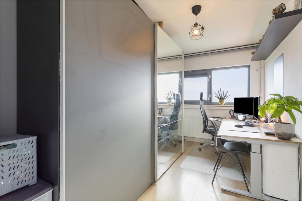 De kleinere kamer is een ideale werkkamer en biedt ook nog eens ruimte voor een grote kledingkast.