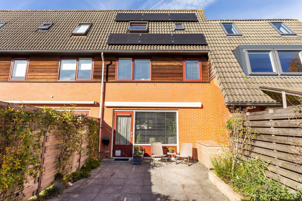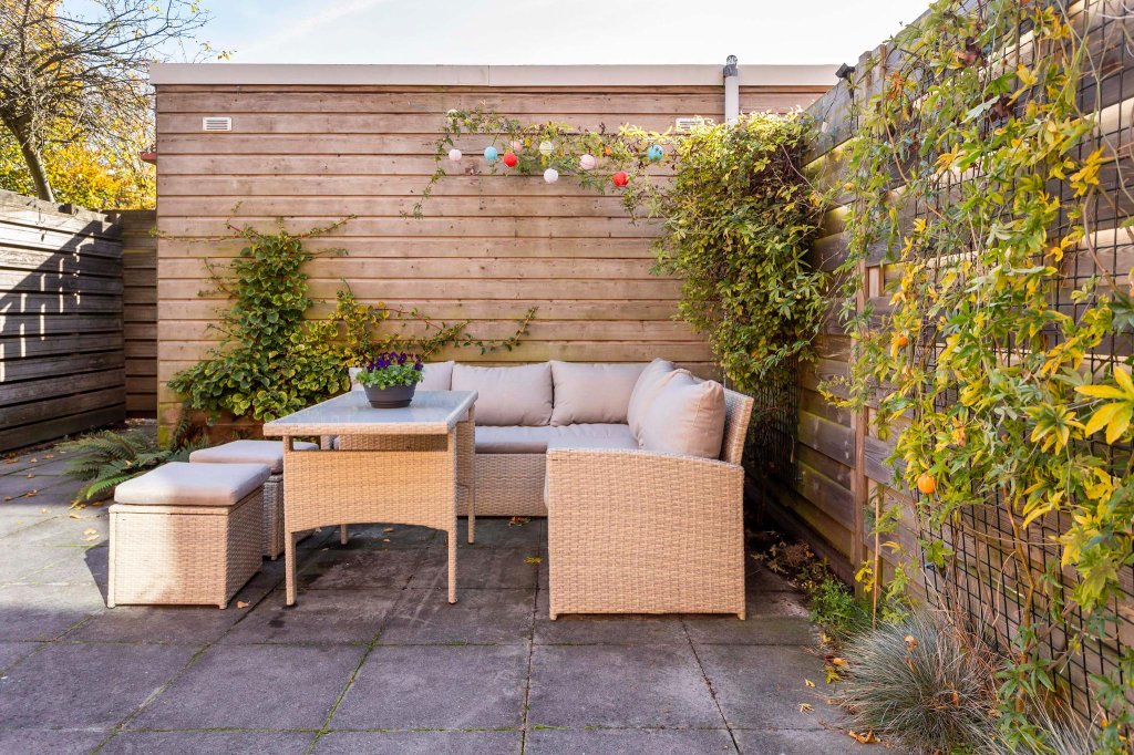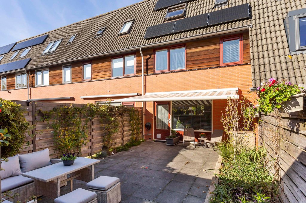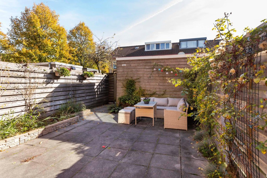 Vanuit de woonkamer kom je in de achtertuin. De tuin is via een achterom te bereiken. Het grootste gedeelte van de tuin is bestraat maar langs de kanten is een border en de schuttingen zijn deels voorzien van klimplanten waardoor er toch groen in de tuin is.
