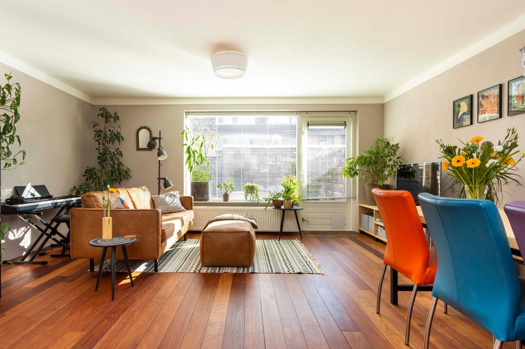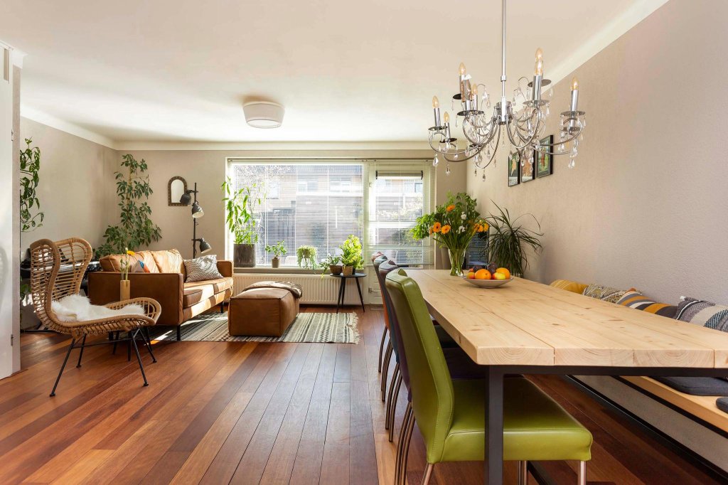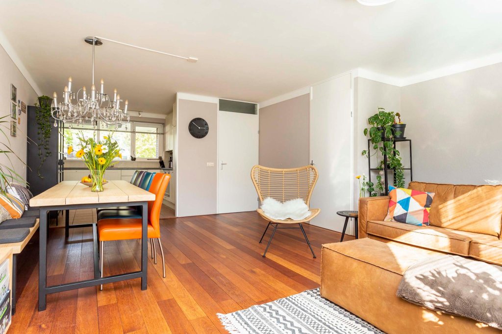 De woonkamer is licht en ruim en voorzien van een massief houten Jatoba vloer. Het plafond is enige jaren geleden professioneel gestukt met een mooie afronding naar de wand wat een rustige en luxe uitstraling geeft.