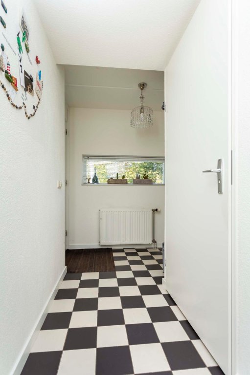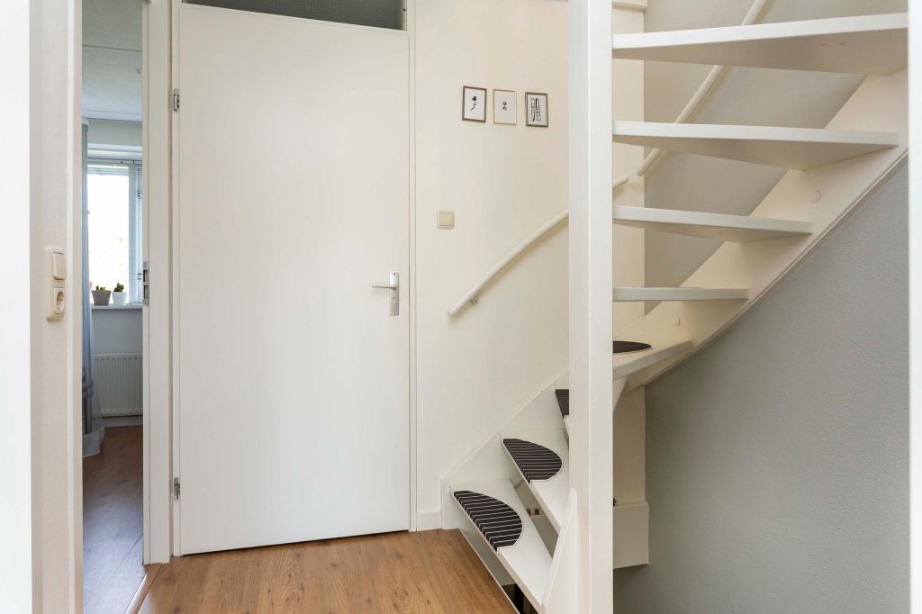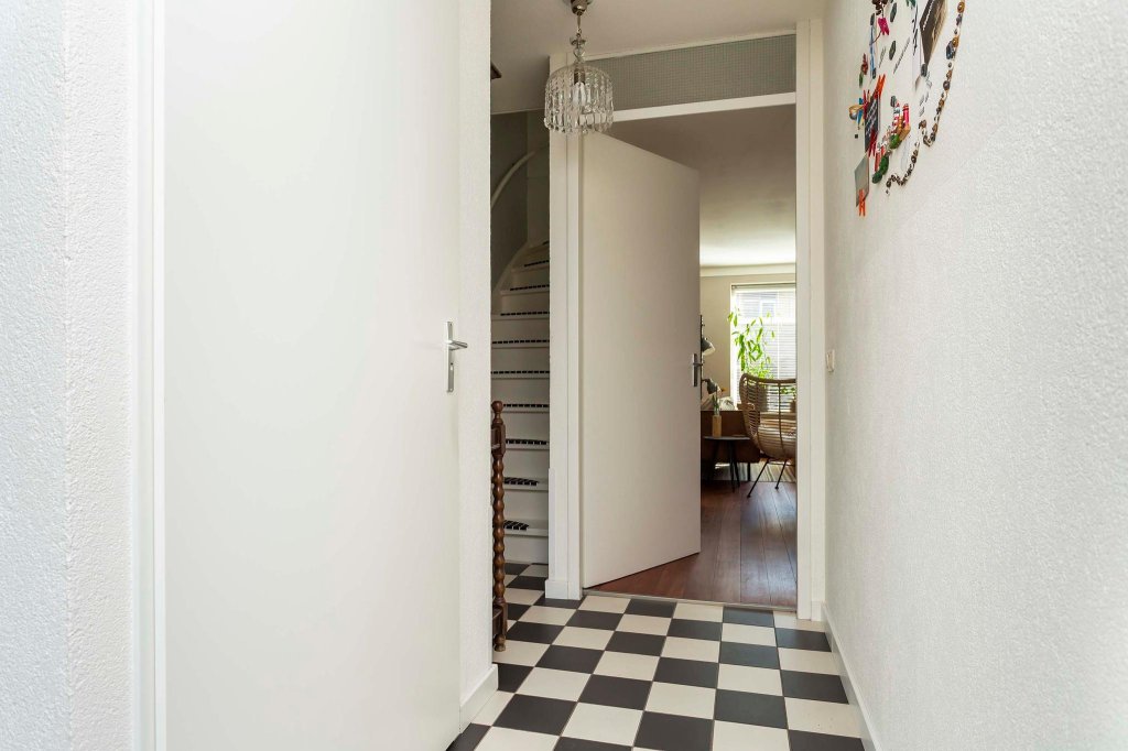 Lichte entree met voldoende ruimte voor een kapstok, meterkast, toilet, trapopgang naar de eerste verdieping en toegang tot de woonkamer met open keuken.