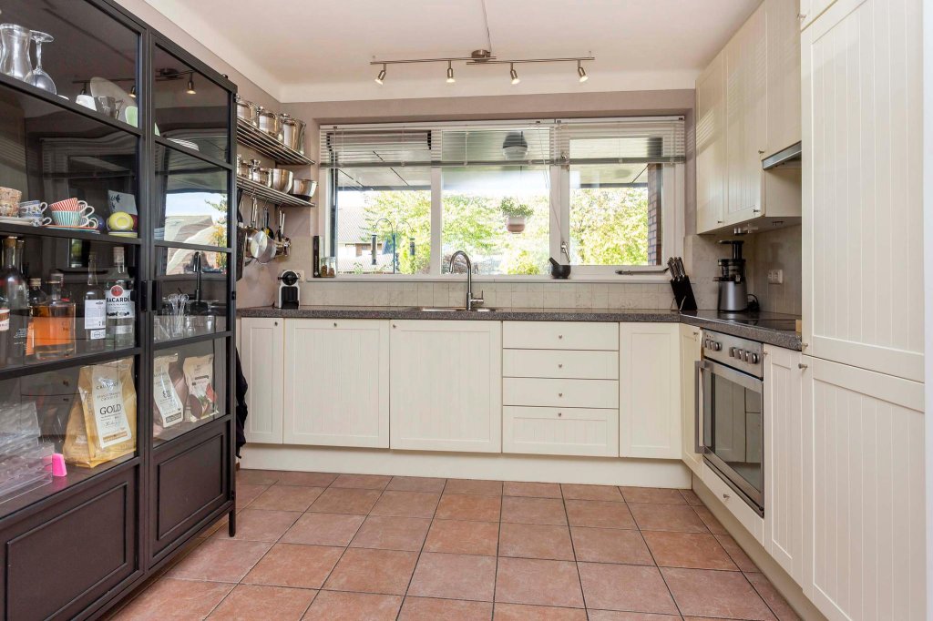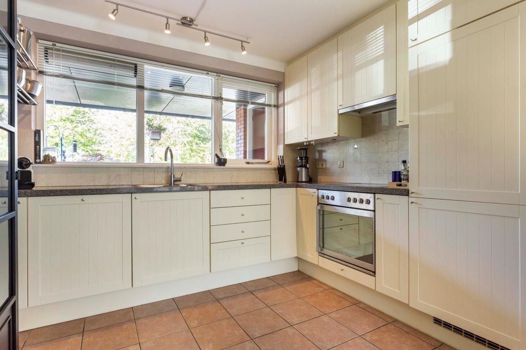 De keuken is voorzien van inbouw koelkast, vriezer, vaatwasser, heteluchtoven, keramische kookplaat en afzuigkap. Er is een granieten aanrecht en dubbele spoelbak. De bovenkastjes lopen door tot het plafond.