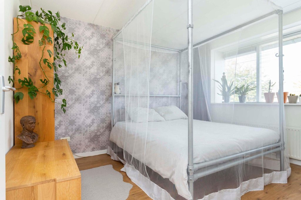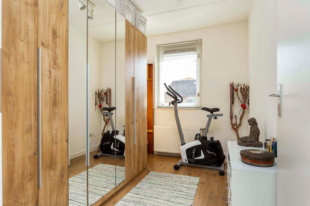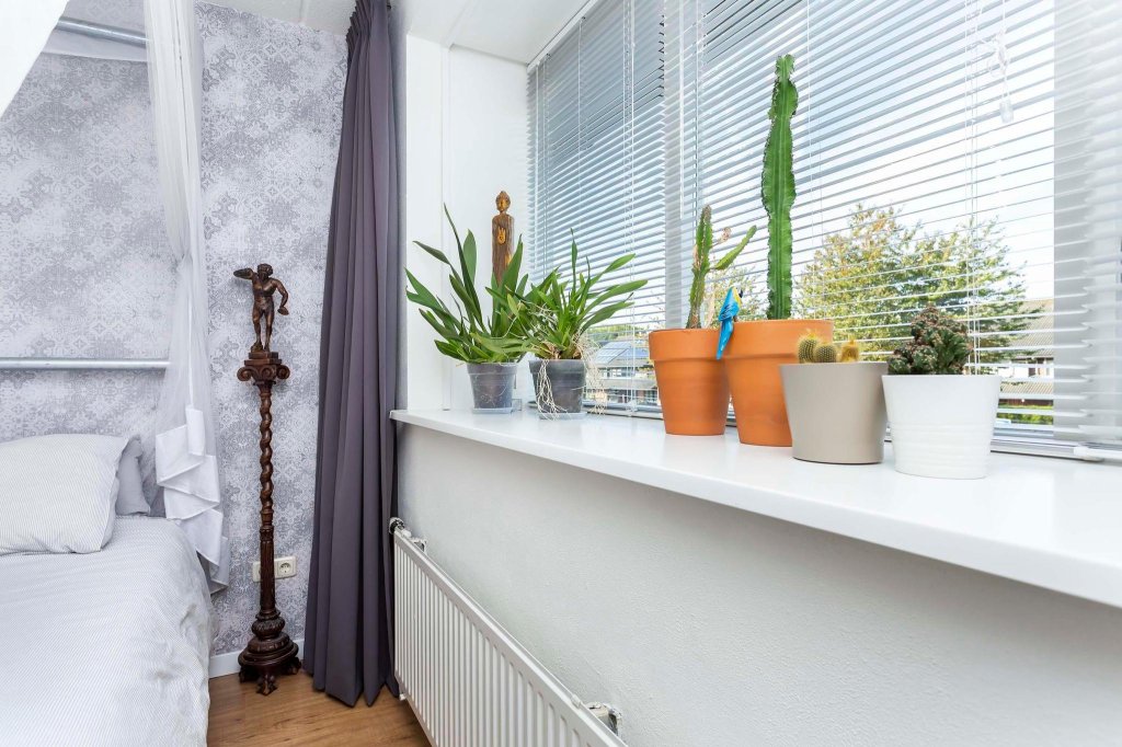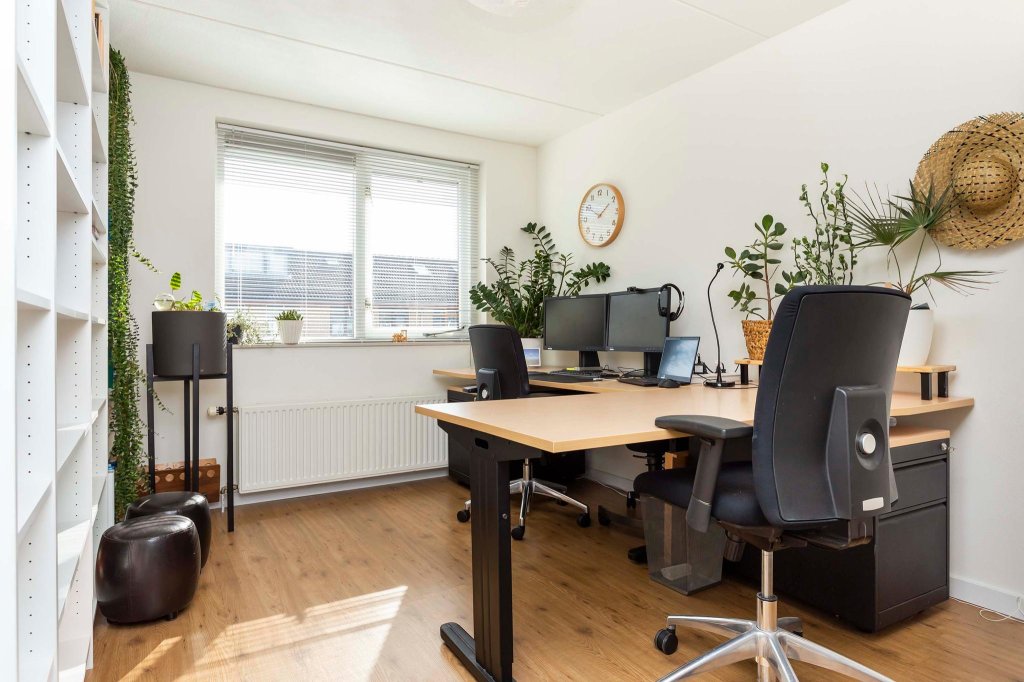 De slaapkamer aan de voorkant is bijzonder door de grote raampartij en de diepe vensterbank. De slaapkamer achter doet nu dienst als kantoor. Het is qua oppervlakte de grootste van de drie slaapkamers en er is nu dan ook voldoende ruimte voor twee ruime werkplekken, een paar grote kasten en een hele wand met boekenkasten. De kleinste van de drie slaapkamers doet nu dienst als kleedkamer.