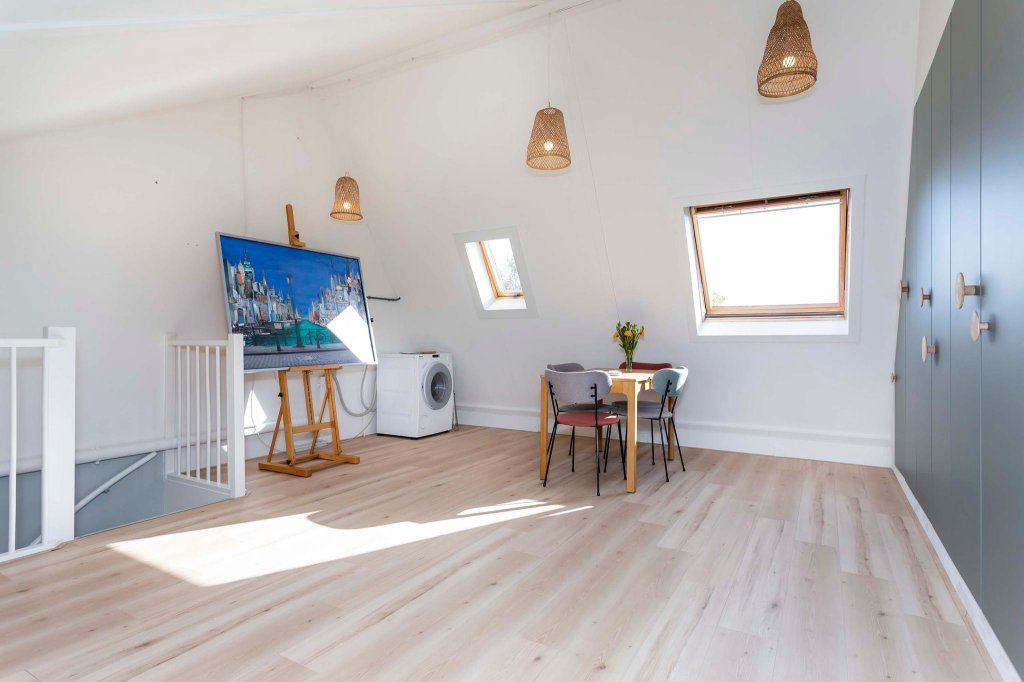 De ruime en heel lichte zolder is niet lang geleden vernieuwd. Er is een grote inbouwkast gemaakt, voorzien van lades en planken. Omdat het pax-kast is, kan de inrichting zonder problemen helemaal worden aangepast aan de wensen.