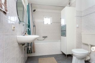 De badkamer is niet nieuw maar wel netjes en beschikt over een ligbad, wastafel, toilet en wat kasten voor extra opbergruimte.