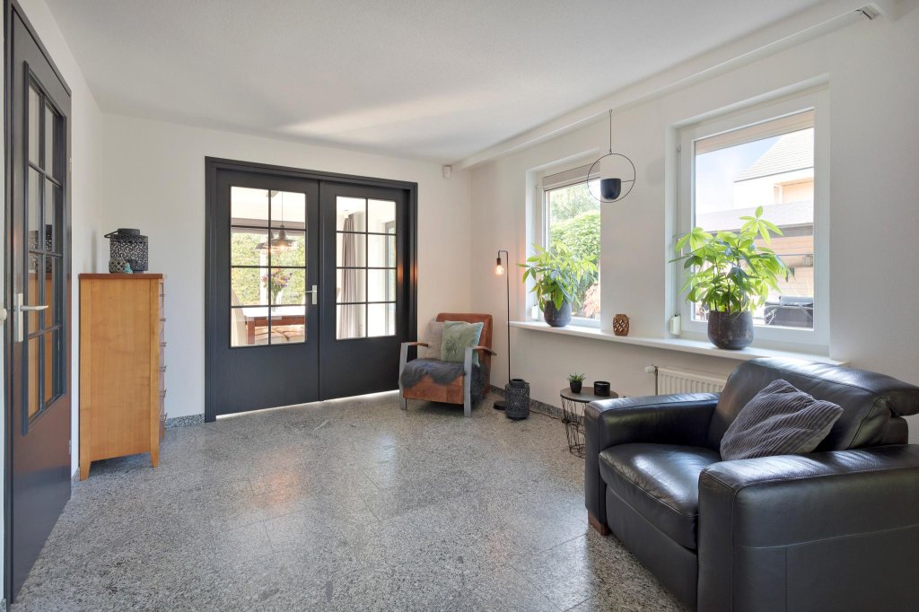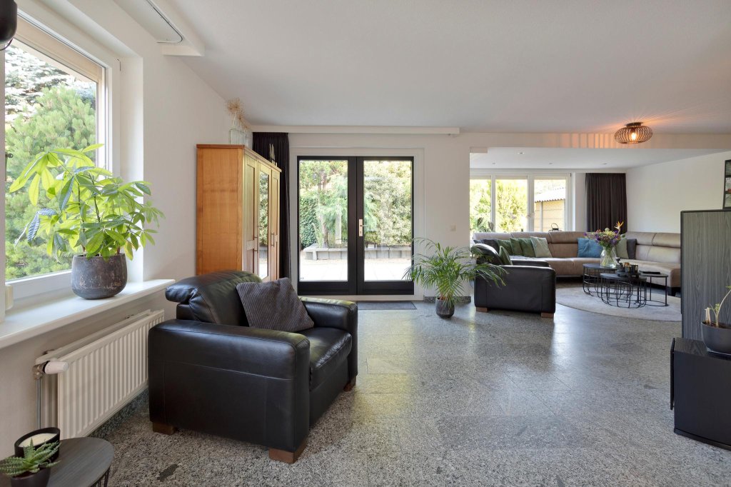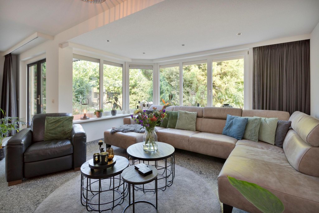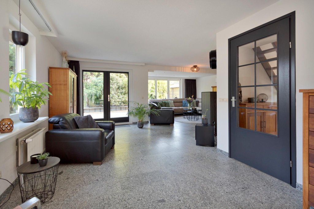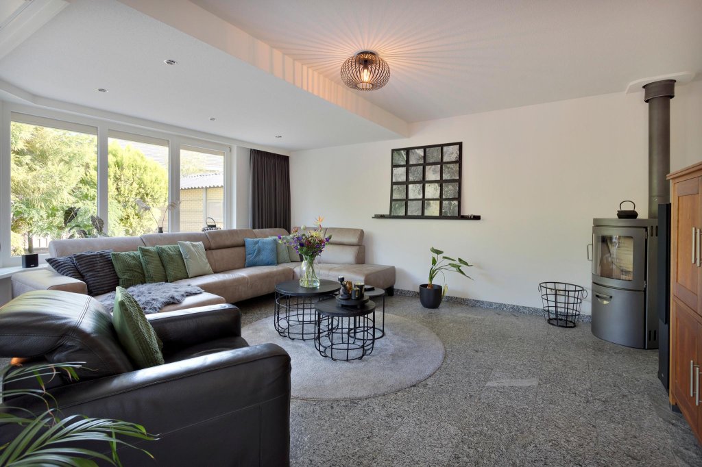 De woonkamer is ruim, met verschillende zitjes en voorzien van een sfeervolle houtkachel. Er zijn rondom ramen die zorgen voor een panoramisch uitzicht op de tuin. De woning is vanbinnen in 2018 geheel professioneel geschilderd. Dat is goed te zien aan de mooie roetgrijze binnendeuren.