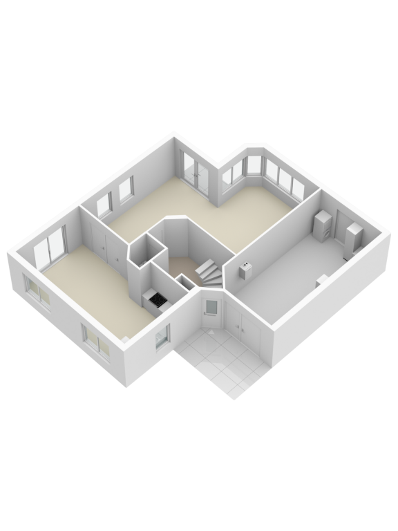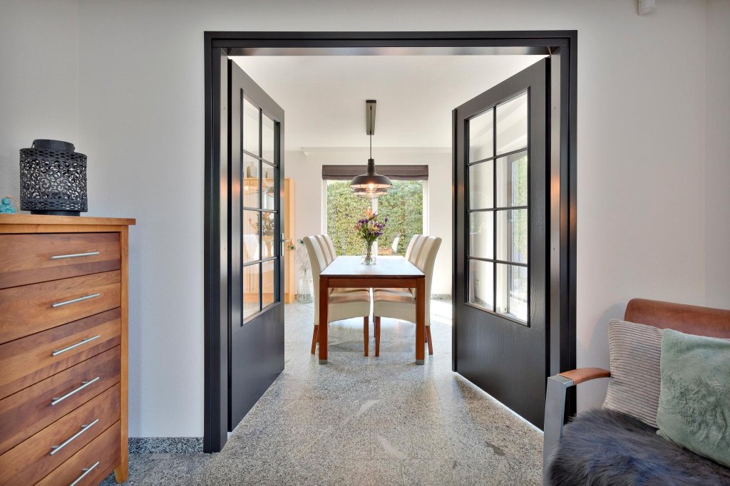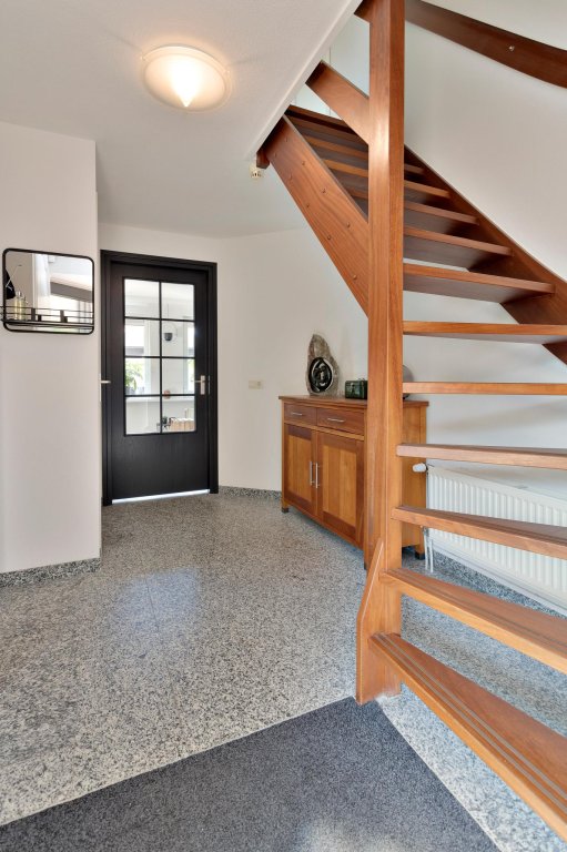 Hier bevindt zich de doorgang naar de garage, het toilet, de hardhouten trap naar boven en de toegang tot de woonkamer.