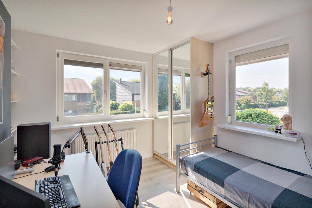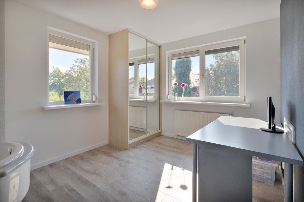 Ruime overloop, kleine slaapkamer die nu in gebruik is als kantoor, 2 mooie middelgrote slaapkamers met eigen wastafel met koud en warm water, tevens voorzien van ruime inbouwkasten. De ouderslaapkamer is ruim en voorzien van een grote inbouwkast. De kamer is voorzien van een energiezuinige airco van Mitsubishi Heavy Industries die geplaatst is in 2020. De badkamer is ruim en zeer netjes onderhouden. Voorzien van een ligbad, hangend toilet, een aparte douche en dubbele wastafel. De gehele etage is voorzien van hoogwaardig Balterio laminaat van het type Quattro Vintage Sandstorm Oak en is gelegd in 2018.