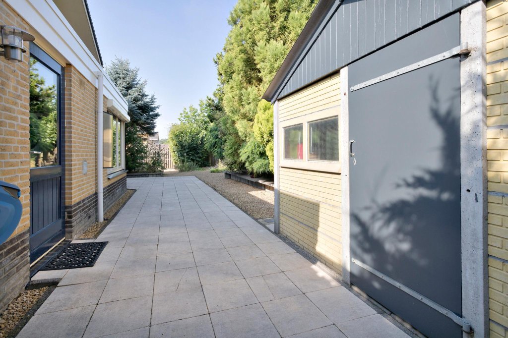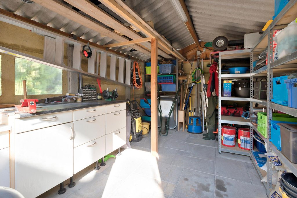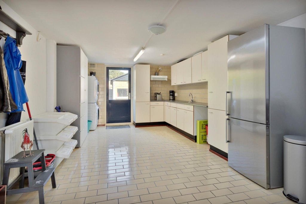 Inpandige garage te bereiken vanuit de hal. Deze is geheel voorzien van plavuizen. Er is een ruime bijkeuken aanwezig met meer dan voldoende opbergruimte. Voorzien van warm en koud stromend water en een afzuigkap. Totaal ruim 27m2.