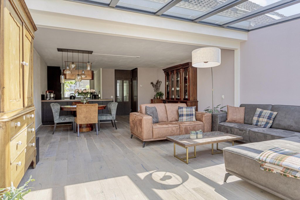 De woonkamer is voorzien van een prachtige houten lamelparket uit 2016. En wat een licht door de geweldige serre, wat een sfeervolle kamer is dit.