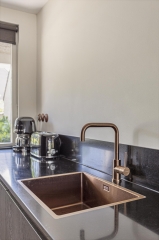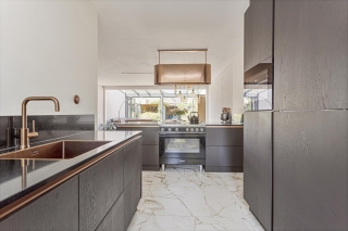 Voorzien van een koperen kraan met spoelbak en hier en daar wat koperen accenten en als kers op de taart, de enorme koperen afzuigkap met plasma filter! Op de vloer licht een grote luxe tegel wat het compleet maakt. Zo kom je ze zelden tegen.
