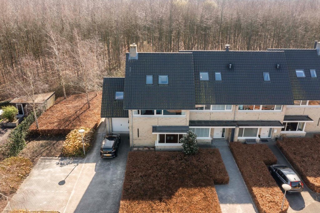 De enorme zitkamer aan de achterkant van de woning biedt makkelijk plaats voor een bank van 8 personen, met heerlijk uitzicht op de tuin en het daar aangrenzende bos. Hier bevind zich ook een praktische trapkast.