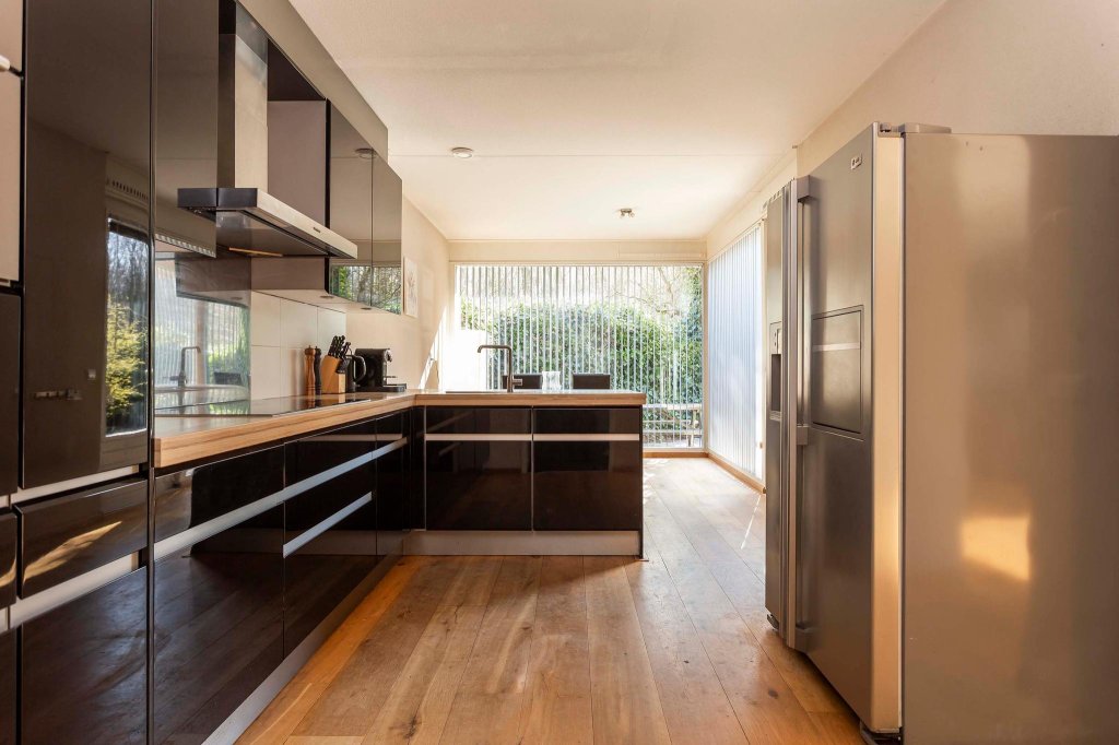 Vanuit de woonkamer loopt u door naar de uitbouw waar de keuken is gerealiseerd met voldoende ruimte voor een eettafel en waar u door de grote raampartijen in verbinding staat met de groene tuin en het bos.