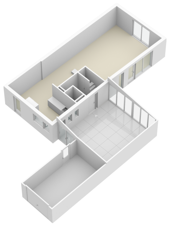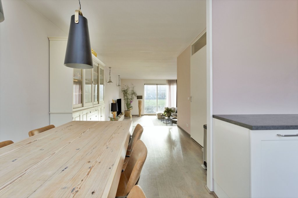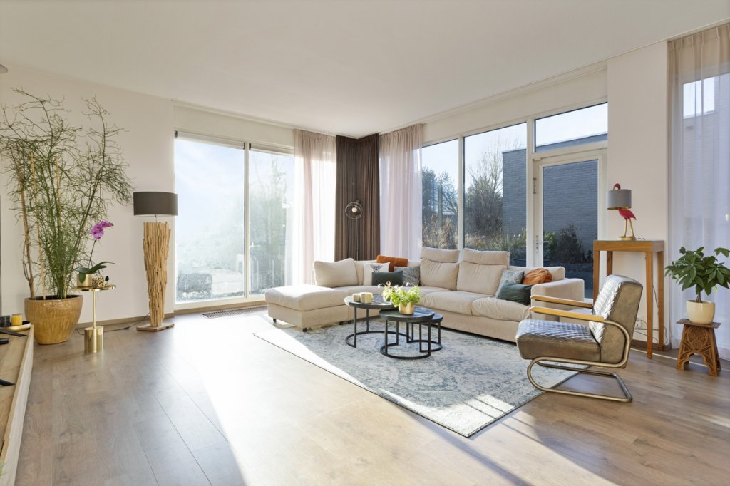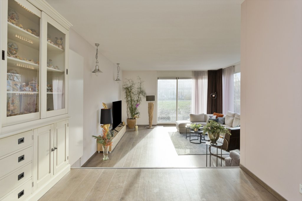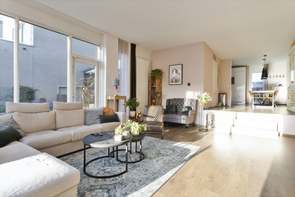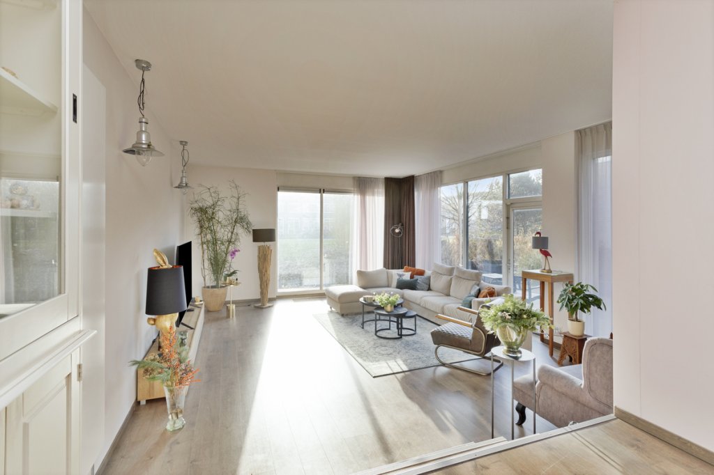 De woonkamer is op een lager niveau. De gehele begane vloer heeft een hoogwaardig laminaat.