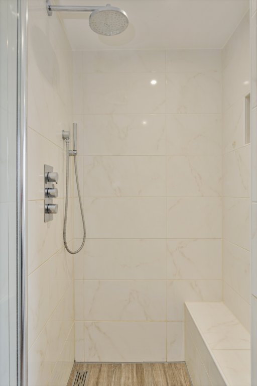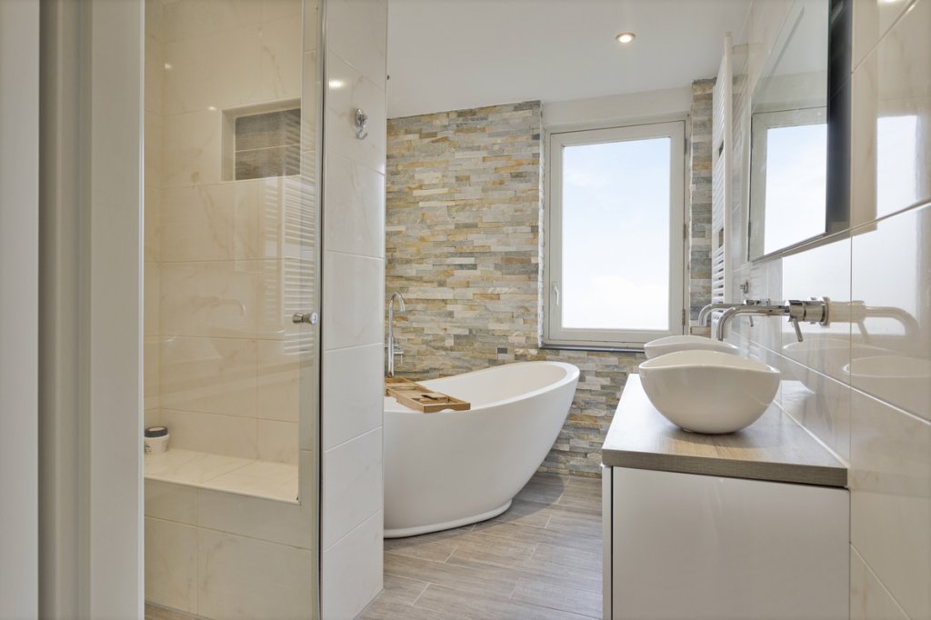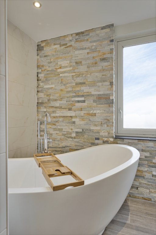 Loop door naar de prachtige luxe badkamer uit 2016, met dubbele wastafel een enorm los ligbad en een fijne aparte douche met zitje dit allemaal met zeer luxe tegels. Tevens is op deze etage een separaat nieuw toilet uit 2020