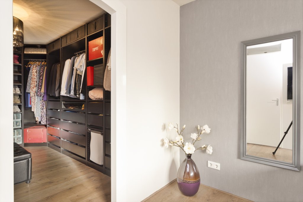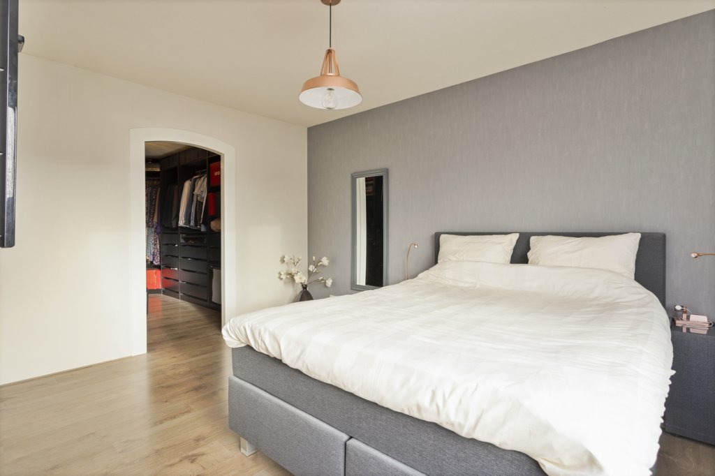 Hier bevindt zich een enorme slaapkamer met extra zijruimte waar een zitje is gecreëerd en dan als op klap op de vuurpijl een enorme walk in closet. Allen met hetzelfde hoogwaardige laminaat als begane grond.
