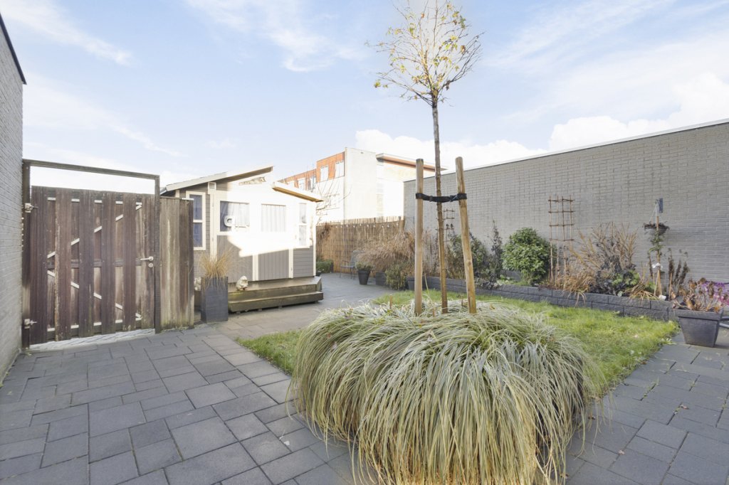 Er is een fijne grote voortuin met voldoende groen, hier staan ook 2 bergingen en de grote garage met oprit voor 2 auto’s