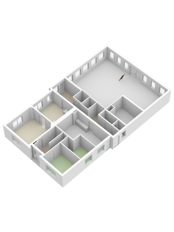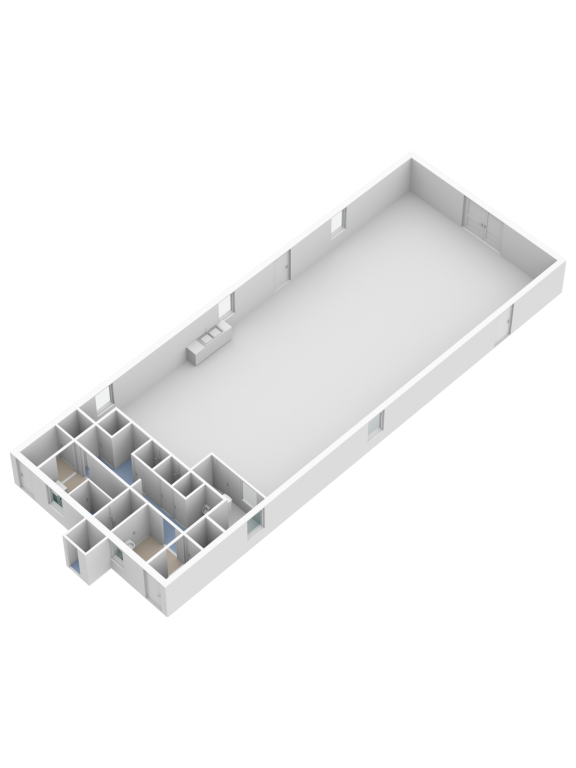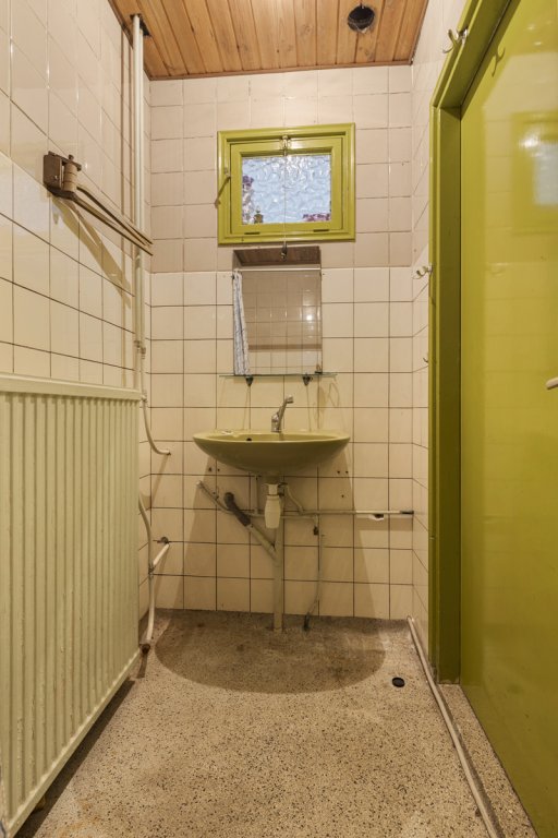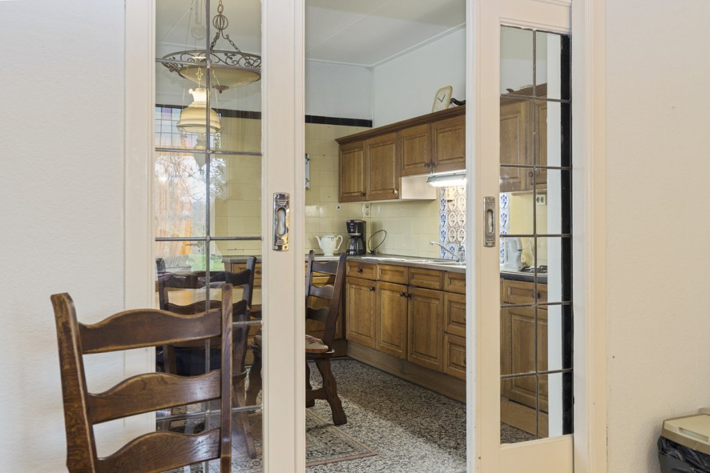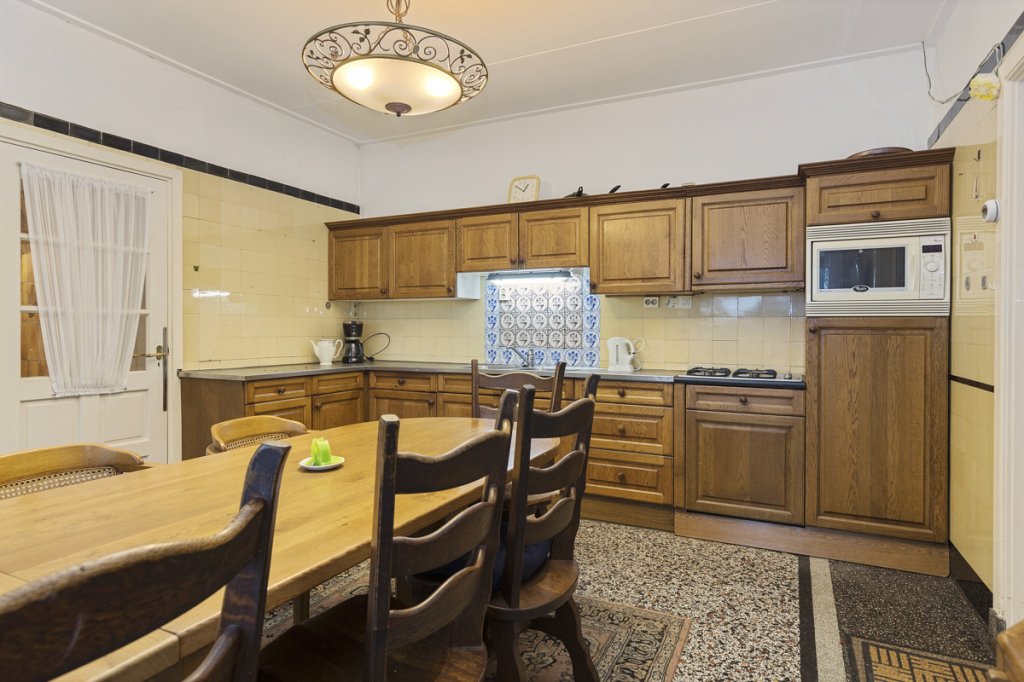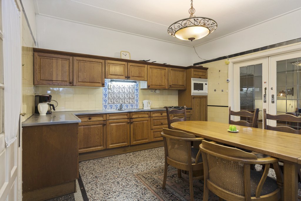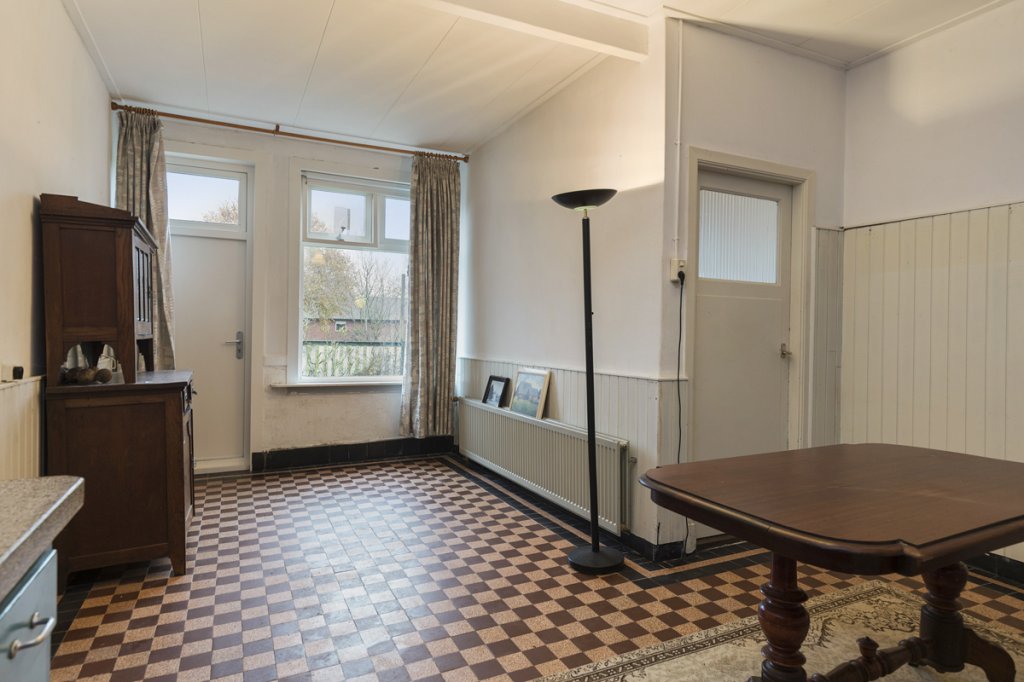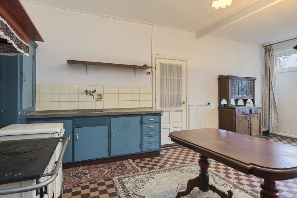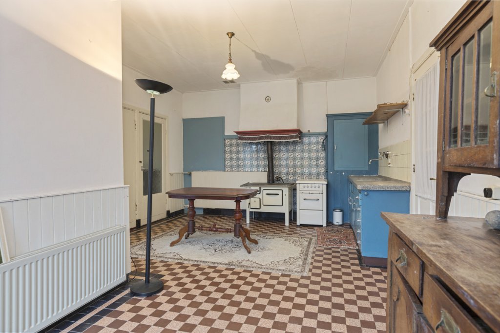 BEGANE GROND: Via een gang/doorgang van de voorgevel tot aan de achtergevel kom je binnen in de keuken, deze is voorzien van inbouwapparatuur. Twee schuifdeuren ontsluiten de woonkamer deze heeft een houtkachel. Na de woonkamer komt u in de hal met voordeur. In de hal vindt u de opgang naar de bovenverdieping. Rechts van de voordeur een extra kamer (vroeger gebruikt als "mooie kamer") en nu als slaapkamer in gebruik. Hierachter een 2e keuken (op de platte grond als bijkeuken aangemerkt). Hier vindt u een 2e slaapkamer. Via deze keuken heb je toegang tot een kelder met een vloeroppervlakte van 24 m2. Aan de andere zijde kun je opnieuw in de gang/doorgang komen. Daar bevinden zich een douches, een badkamer, een toilet en de toegang tot te voormalige deel (berging).