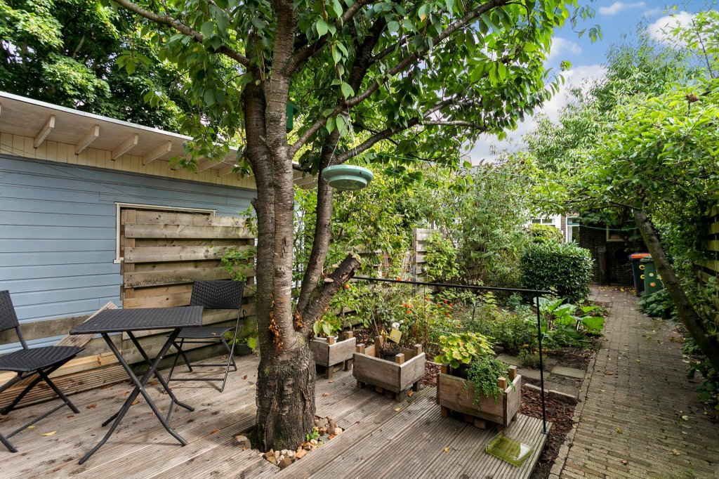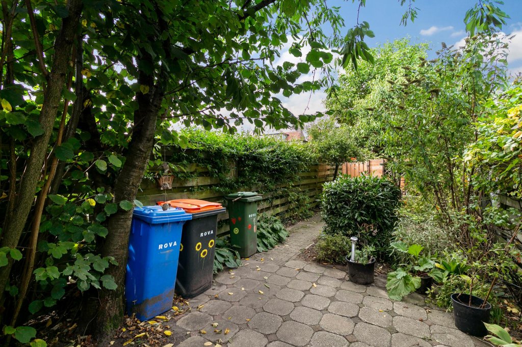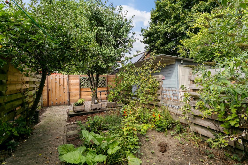 Tuin: De zonnige achtertuin is gelegen op het westen en is aangelegd met veel groene struiken en beplanting. (Appel, peer, pruim en druif zijn aanwezig naast diverse bessenstruiken) Er is een speels niveauverschil, er zijn meerdere terrassen en achterin de tuin is het zowel in de zomer als de winter goed toeven. De tuin is via achterom te bereiken.