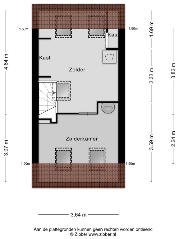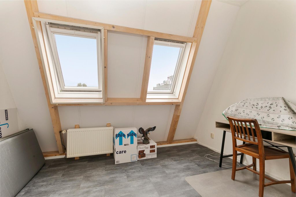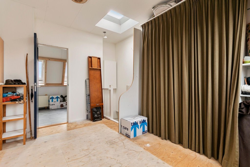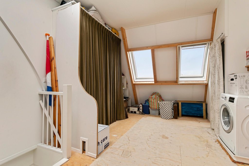 Opbouw: deze ruimte is momenteel in gebruik als vierde slaapkamer en bergruimte. Aan de voorzijde is de slaapkamer gesitueerd en heeft twee Velux dakramen. De achterzijde heeft ook twee Velux dakramen zodat er heel veel lichtinval is gedurende de dag. Hier bevindt zich ook de cv-ketel (2014) en wasmachine-aansluiting.
