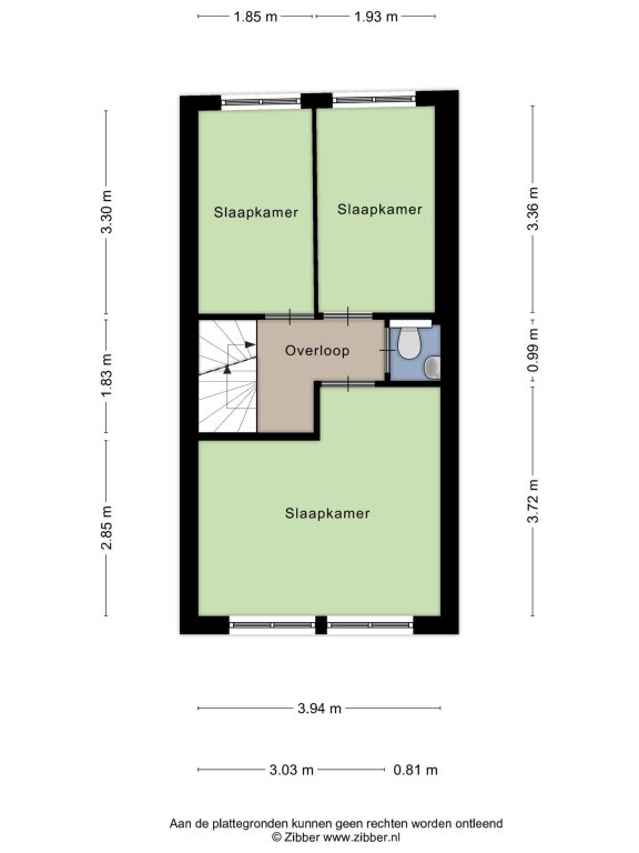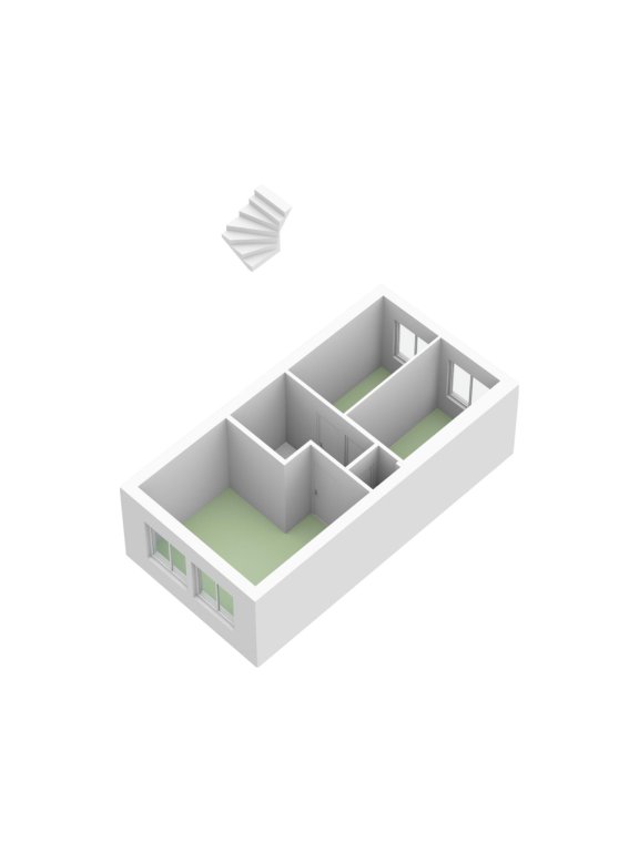 Eerste verdieping: overloop met trapopgang naar zolder, De eerste slaapkamer aan de voorzijde heeft over bijna de gehele breedte ramen. De tweede en derde slaapkamer liggen aan de achterzijde. Op de overloop is een vaste kast waar nu een SaniBroyeur is geplaatst. Op deze etage is het mogelijk om een ruime badkamer te creëren met een douchecabine, toilet en een wastafel.