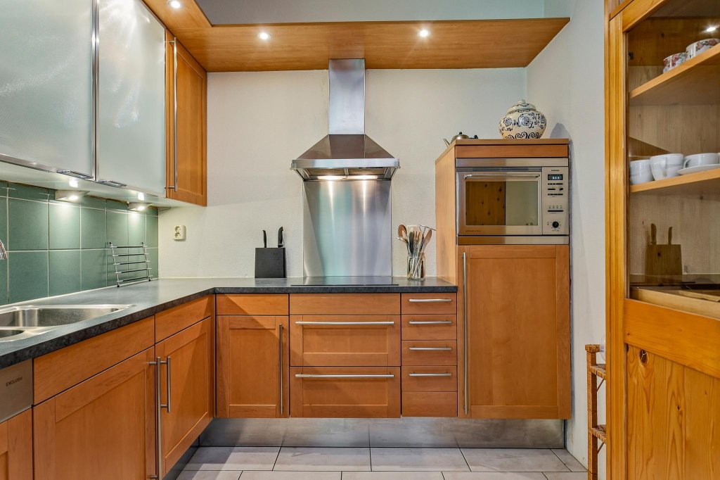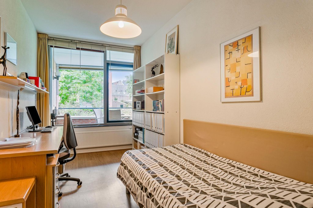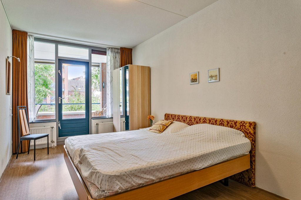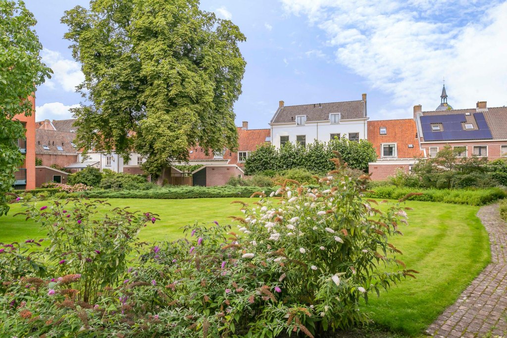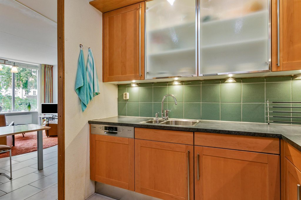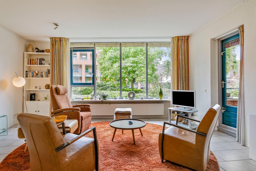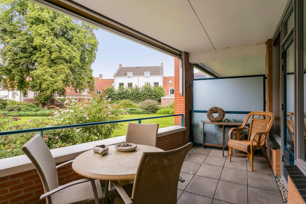 Het appartement heeft een lichte ruime woonkamer met open keuken voorzien van diverse inbouwapparatuur. Vanaf de woonkamer heeft u direct toegang tot het terras op het brede balkon (12 m2). Het balkon grenst aan de prachtig aangelegde parktuin met uitzicht op de authentieke Muurhuizen. Hier staan onder meer een walnoten- en kastanjeboom, diverse vlinderstruiken en andere kleurrijke bloemen en planten. Een genot om naar te kijken en bijzonder om zo'n mooie grote tuin midden in de stad te hebben.
