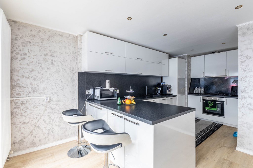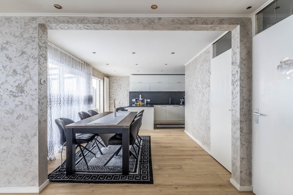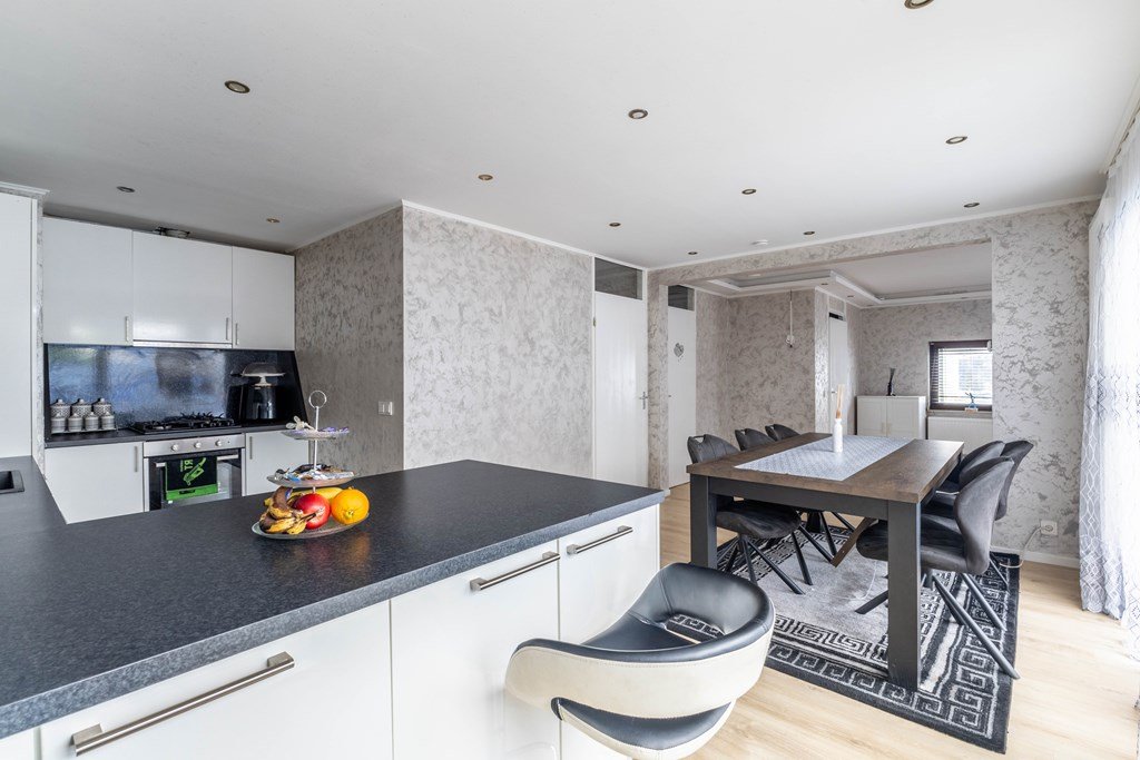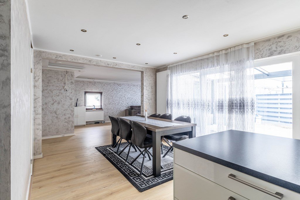 Er zijn luxe openslaande deuren naar de tuin. In de tuin is er een gezellige mooie ruime serre gesitueerd. Vanuit de woonkamer is de halfopen keuken uit 2022 te bereiken, deze is voorzien van diverse inbouwapparatuur.
