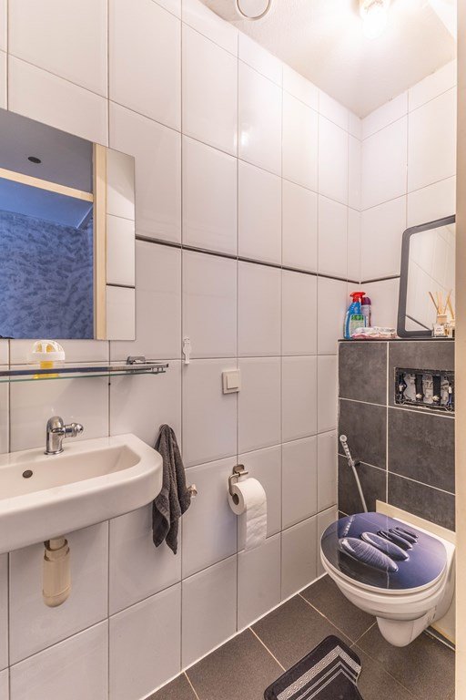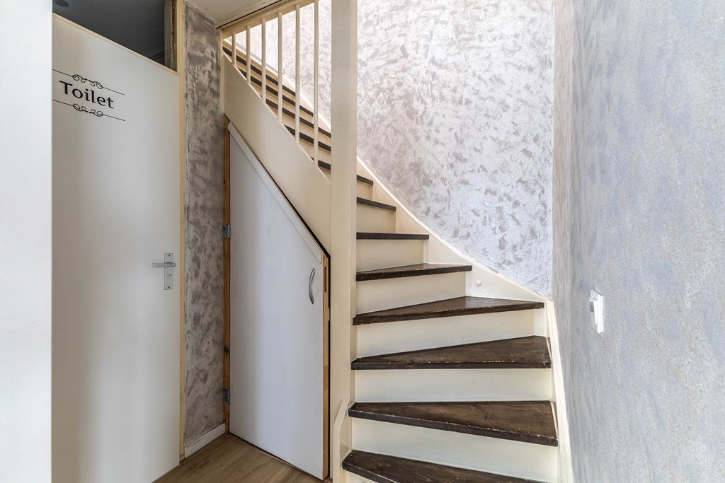 Vanuit de eetkamer is er toegang tot de hal met een separaat toilet en de trap naar boven.