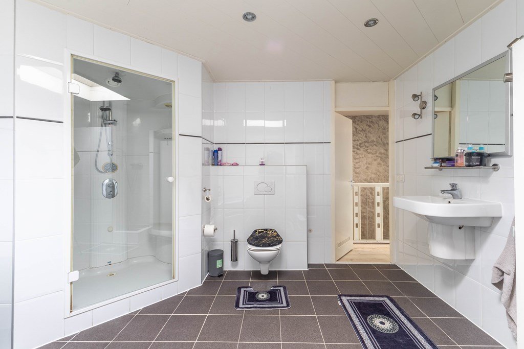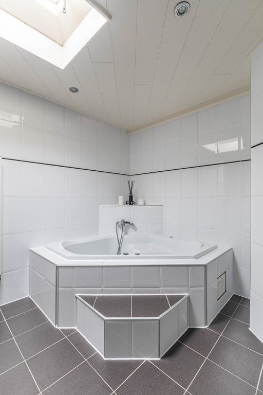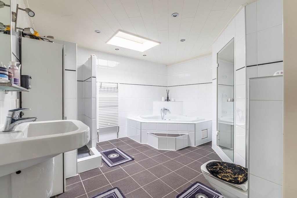 De badkamer is echt een wellness relax ruimte. Prachtig zit/lig bad, een inloopdouche en een stoomcabine. Uiteraard ontbreekt de wastafel met spiegel niet en het tweede toilet.