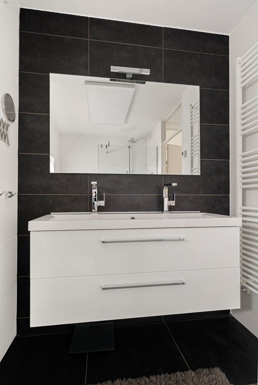 Op de eerste verdieping bevinden zich twee ruime slaapkamers en een moderne badkamer met inloopdouche, dubbele wastafel en tweede toilet. Alles netjes afgewerkt en praktisch ingedeeld.
