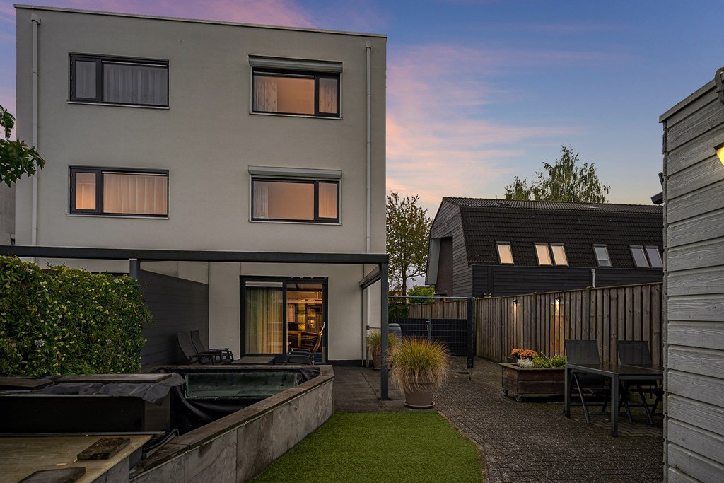 Aan de achterzijde bevindt zich de ruime woonkeuken, uitgevoerd in een neutrale, moderne stijl en voorzien van diverse inbouwapparatuur. De grote schuifpui geeft direct toegang tot de tuin, waardoor binnen en buiten naadloos in elkaar overlopen.