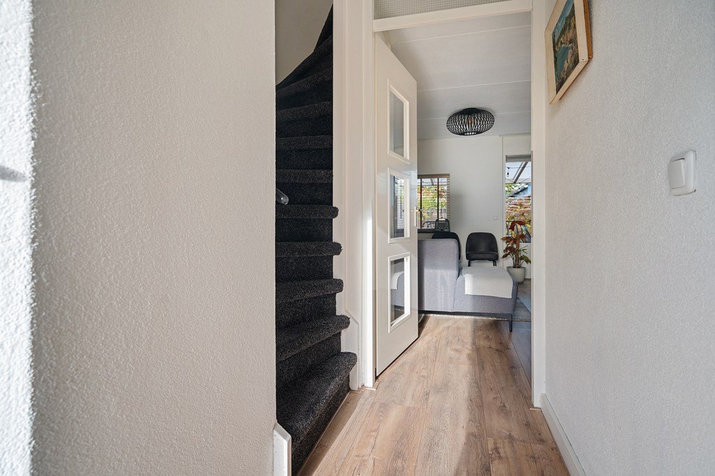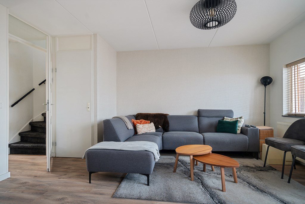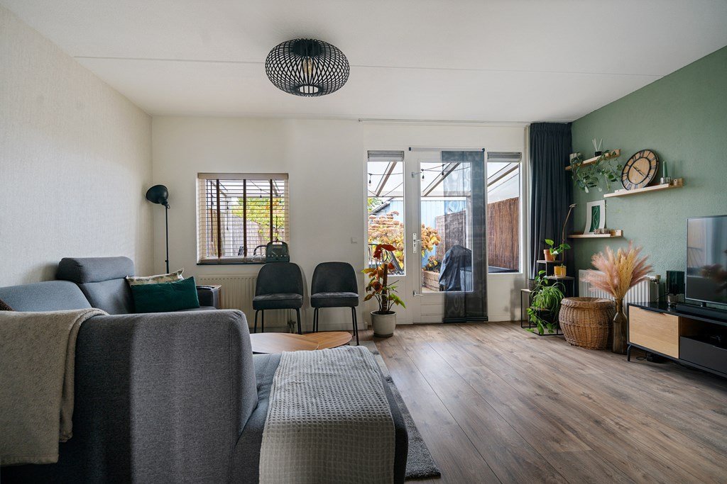 Via de hal, met meterkast, trapopgang naar de eerste verdieping en toilet, bereikt u de woonkamer. De lichte en ruime woonkamer biedt voldoende ruimte voor een comfortabele zithoek en heeft via de achterzijde toegang tot de tuin met overkapping.