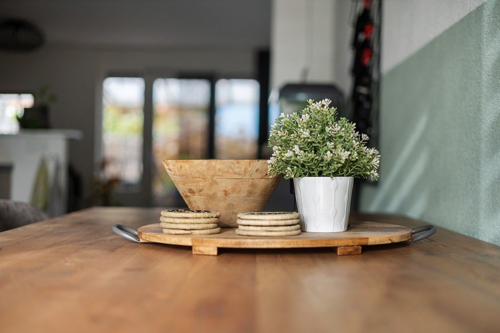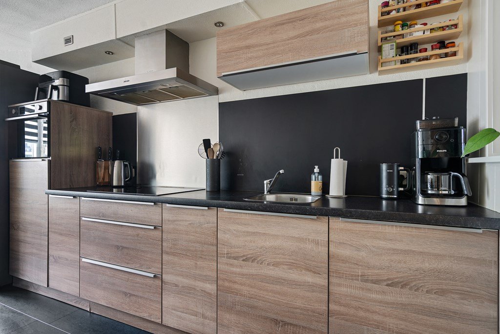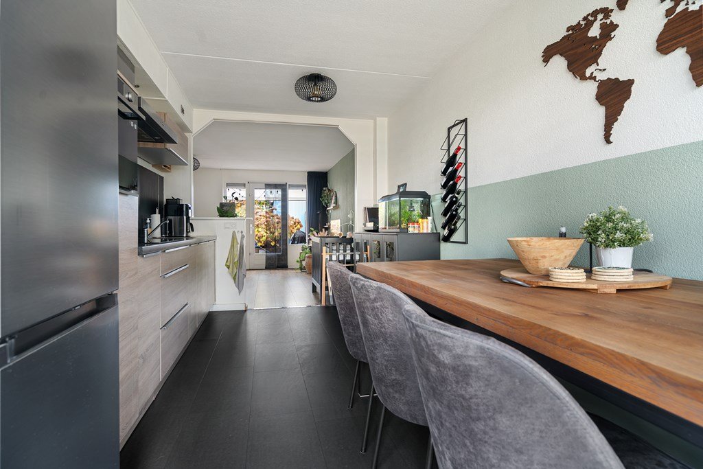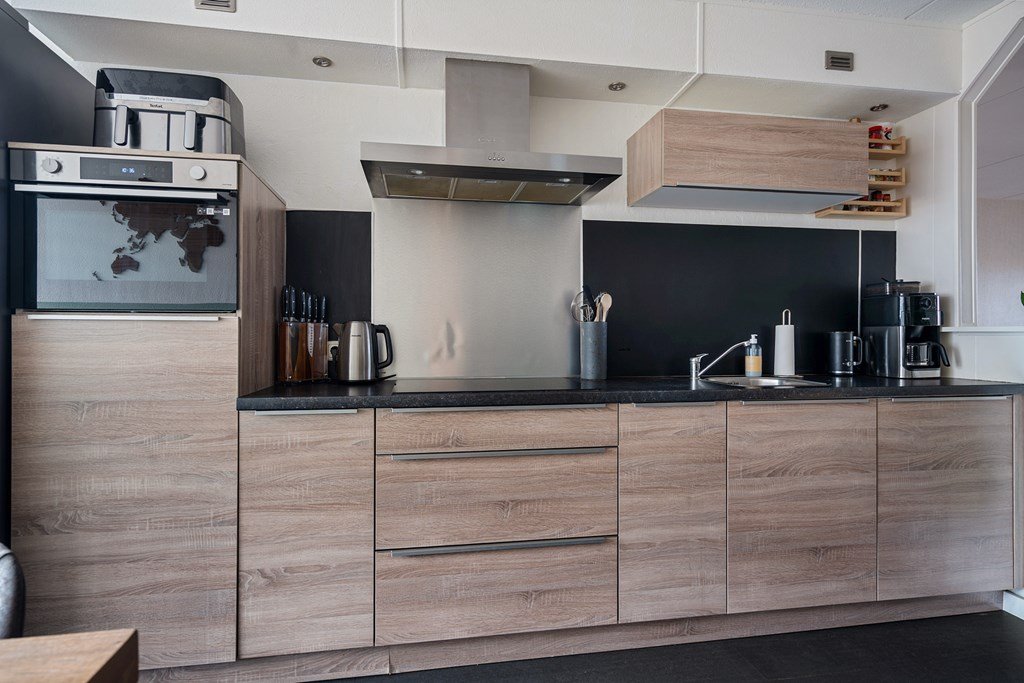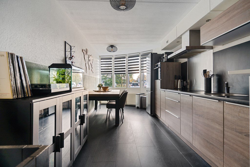 De halfopen keuken bevindt zich aan de voorzijde van de woning en is voorzien van een vaatwasser, combi-oven/magnetron en elektrische kookplaat. Er is daarnaast voldoende ruimte voor een eettafel.