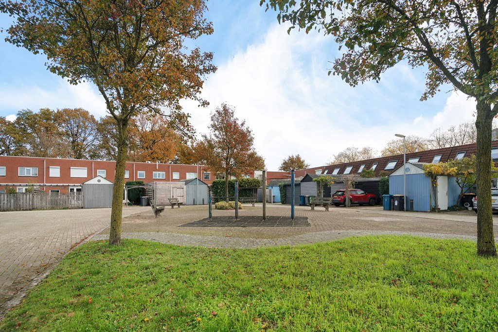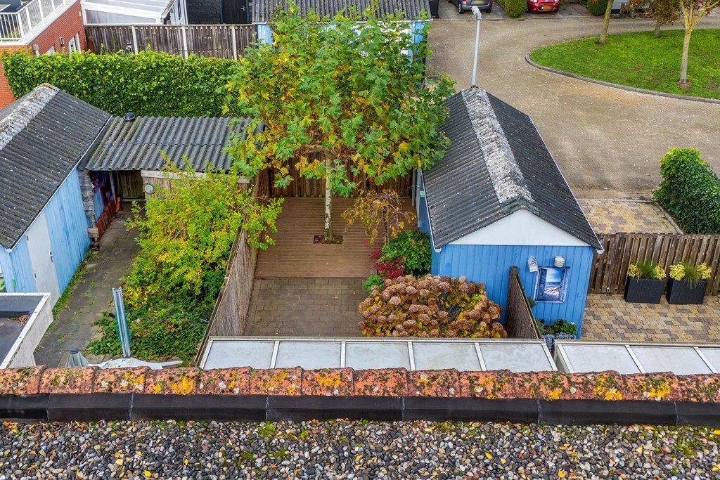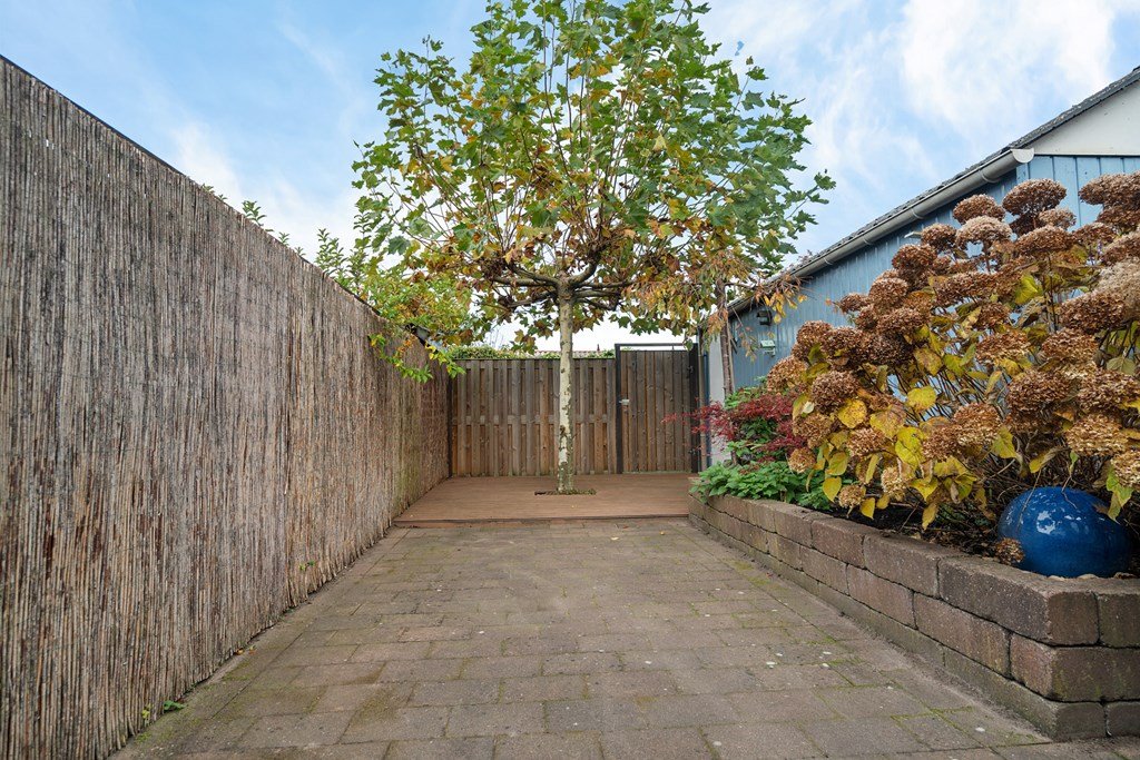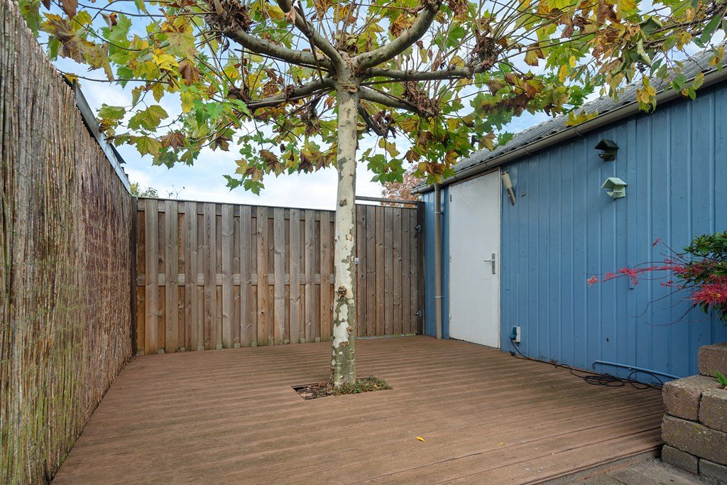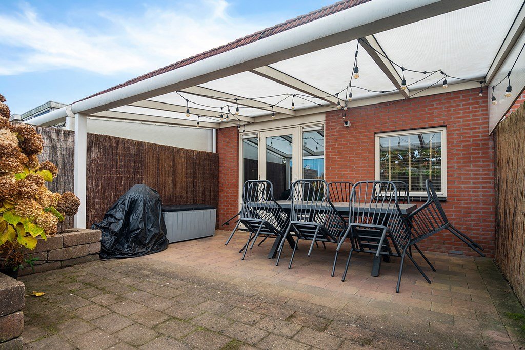 De achtertuin is diep en onderhoudsvriendelijk aangelegd, met direct aan de woonkamer een overkapping waar u beschut kunt zitten. Achterin de tuin bevindt zich een achterom en de houten schuur.