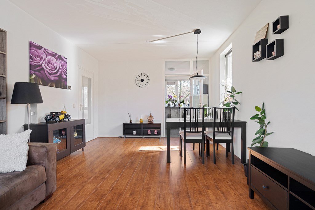 De woonkamer is heerlijk licht en ruim opgezet, met een prettige sfeer en directe verbinding naar de keuken. De keuken is eenvoudig uitgevoerd, maar biedt volop mogelijkheden om naar eigen smaak te moderniseren.