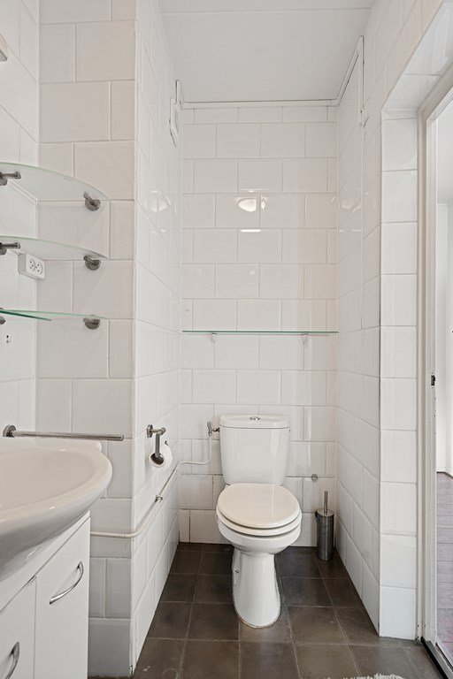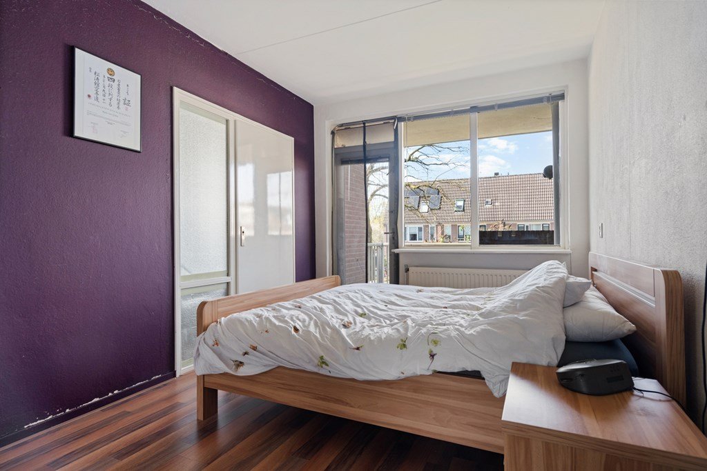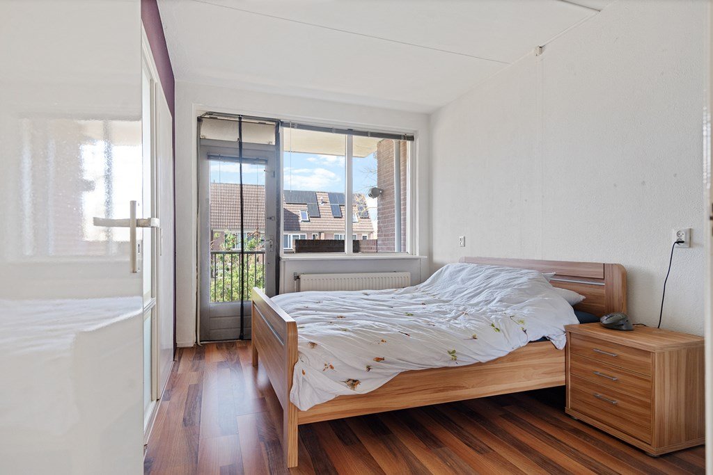 De badkamer is compleet ingericht met een ruime douche, toilet en wastafelmeubel. De slaapkamer heeft een fijn formaat en biedt toegang tot het balkon op het westen — dé plek om na een lange dag te genieten van de avondzon.