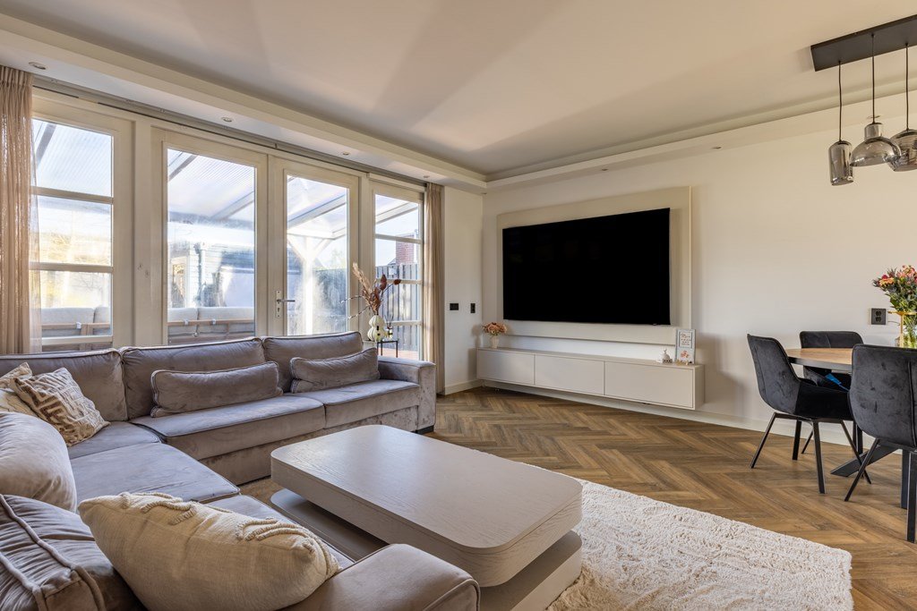 De begane grond is stijlvol afgewerkt met een luxe visgraat PVC-vloer die warmte en karakter toevoegt aan de ruimte. De tuingerichte woonkamer is heerlijk licht en vormt het hart van het huis. Grote raampartijen zorgen voor een mooie verbinding met buiten, waar de veranda uitnodigt tot lange avonden tafelen en ontspannen.