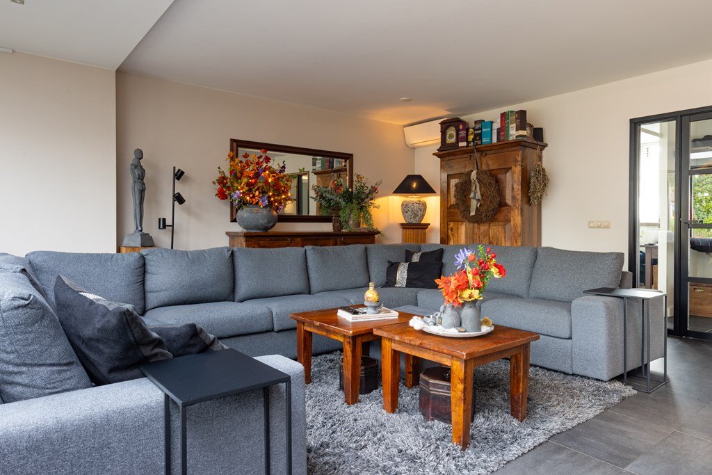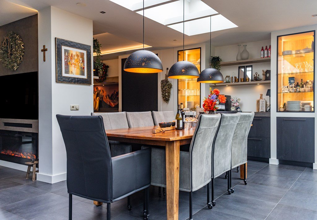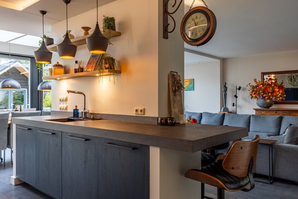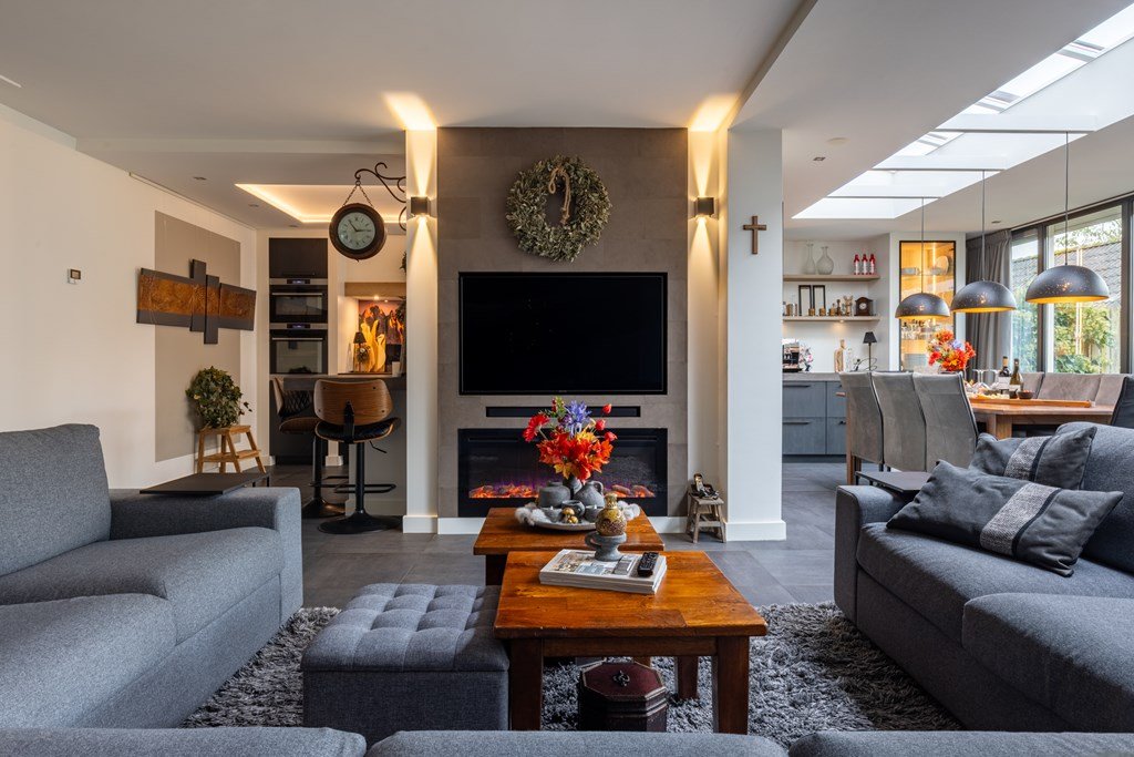 De royale, aan de achterzijde uitgebouwde woonkamer is een echte eyecatcher: voorzien van een fraaie plavuizen vloer met vloerverwarming, een stijlvolle designhaard, strak gestucte wanden en plafonds, en een lichtstraat die zorgt voor een prachtige lichtinval. De woonkamer met open keuken beslaat samen circa 63 m² en vormt een heerlijke leefruimte.
