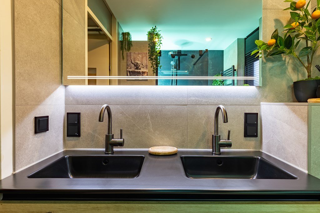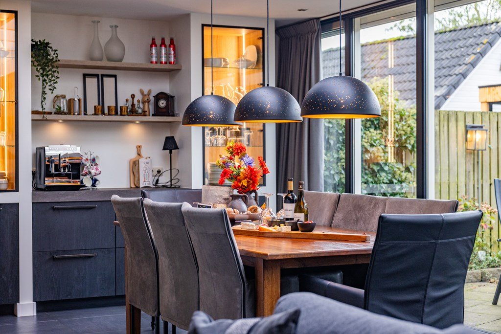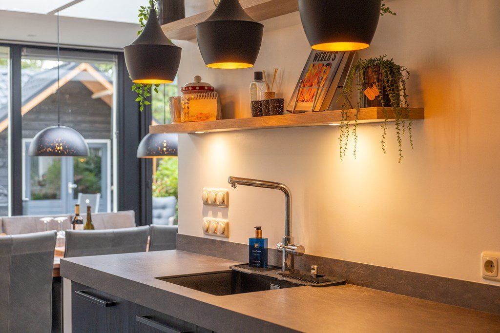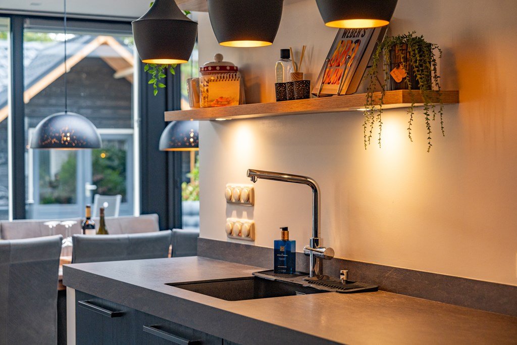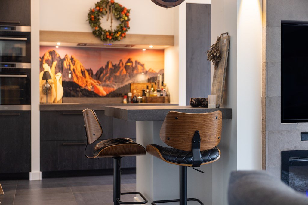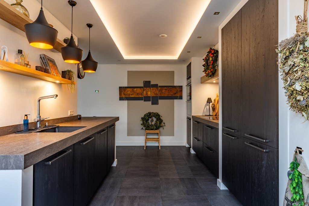 De moderne, luxe keuken aan twee zijden gesitueerd (bouwjaar 2019) is uitgerust met hoogwaardige inbouwapparatuur, een praktische ontbijtbar en volop werk- en opbergruimte — kortom: een feest om in te koken.