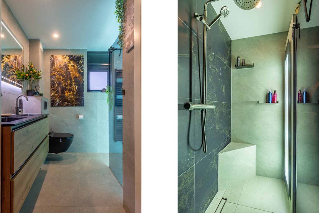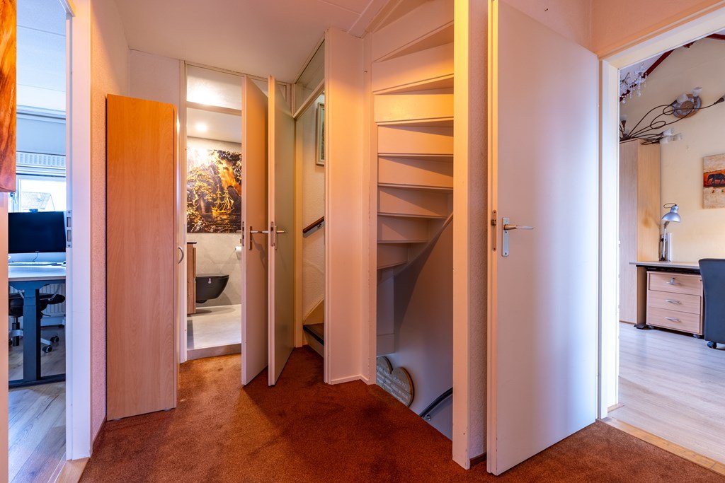 Overloop met vaste trap en berging. Drie ruime slaapkamers en een recent vernieuwde (2025), luxe badkamer met designmeubel (dubbele wastafel), modern zwevend tweede toilet en een riante inloopdouche met Sunshower.